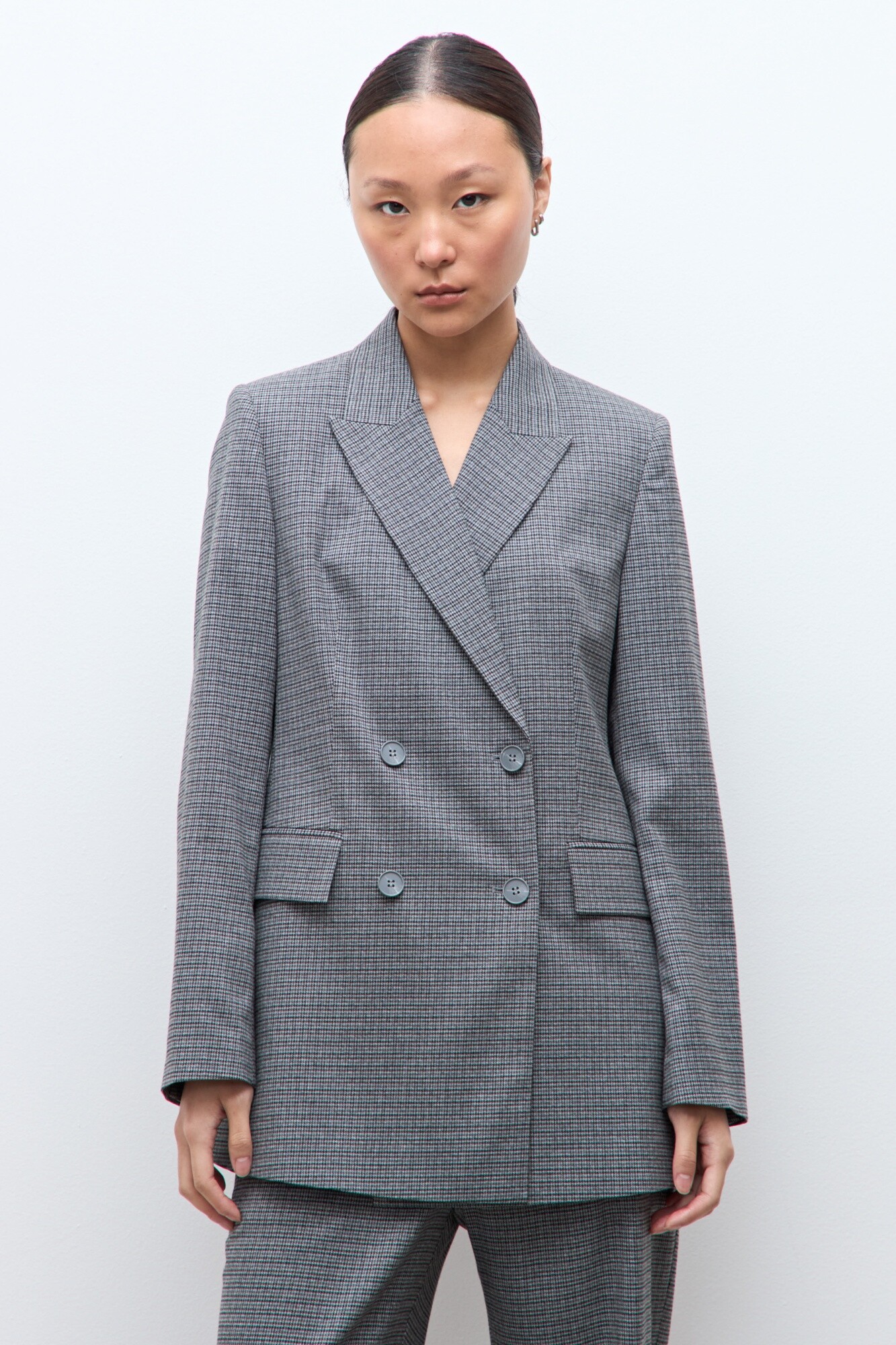 Blazer con cuello solapa y hombreras. Manga larga. Cierre frontal cruzado con botones.