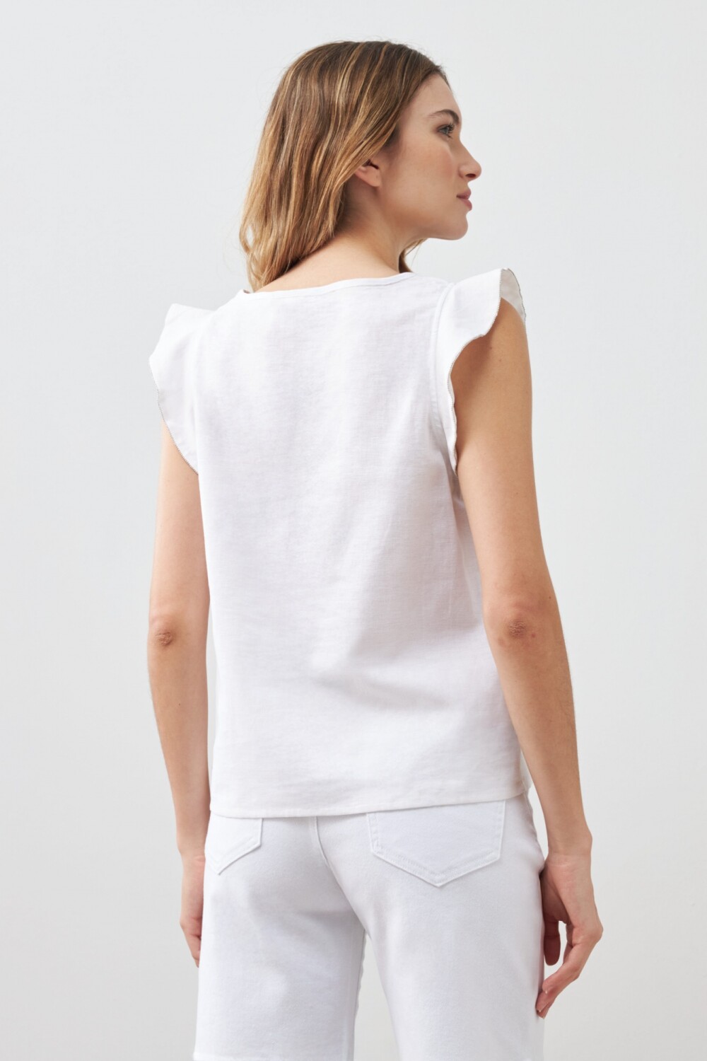 Blusa de escote bote con volados en sisa. Detalle de vivo metalizado.
