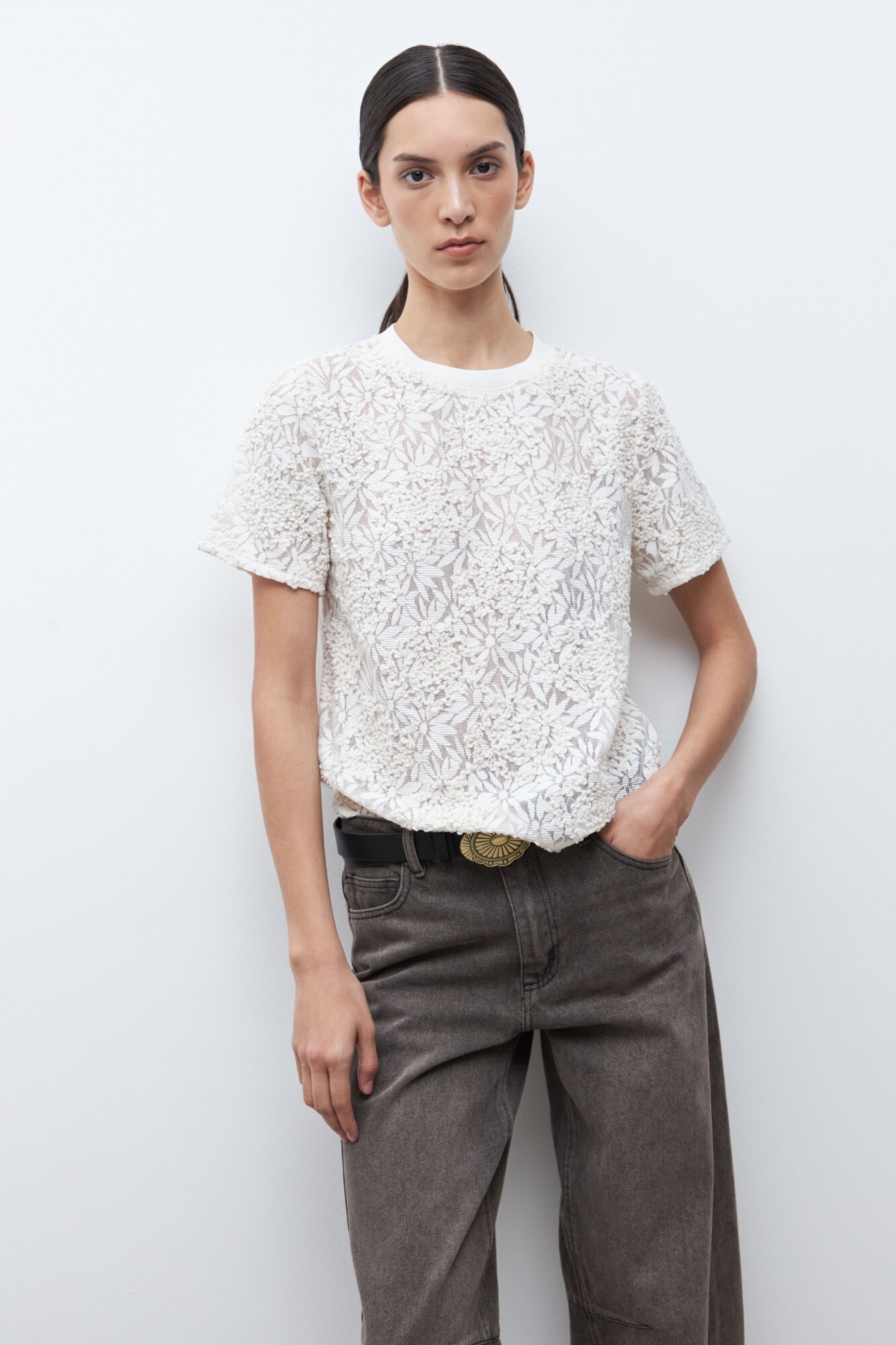 Blusa de escote a la base. Manga corta. Delantera confeccionada en encaje bordado.