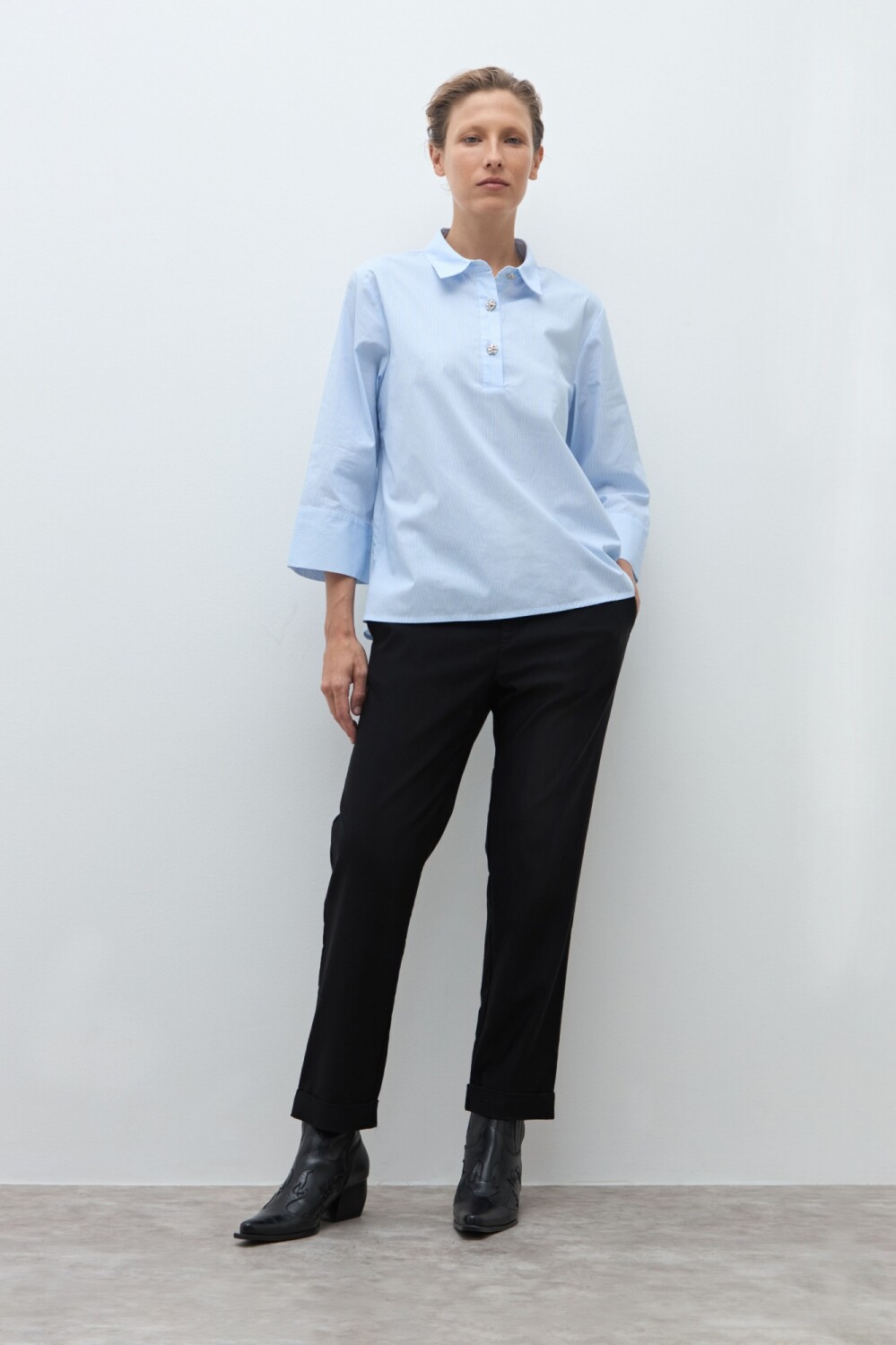 Blusa con cuello camisero. Manga tres cuartos.