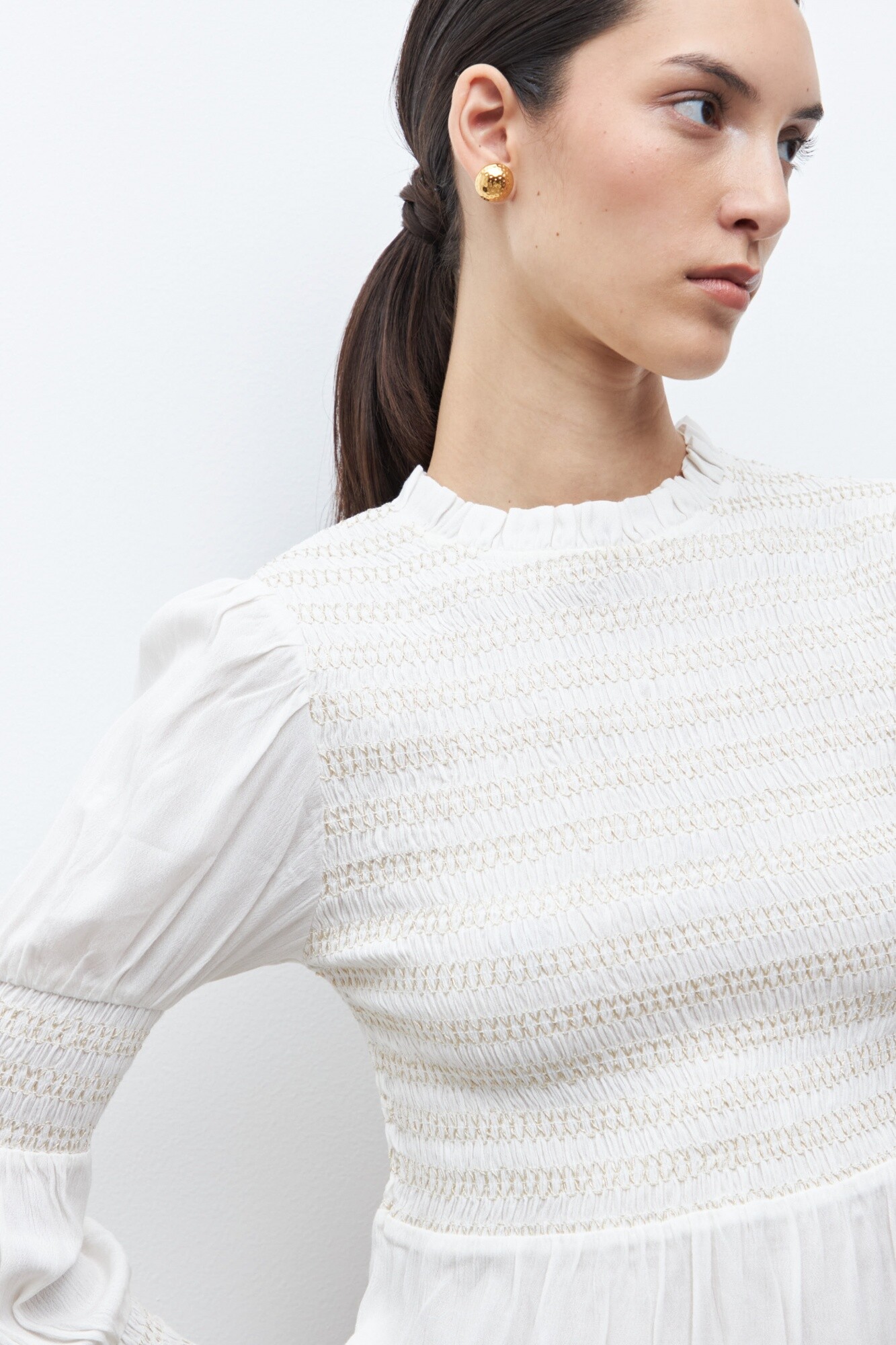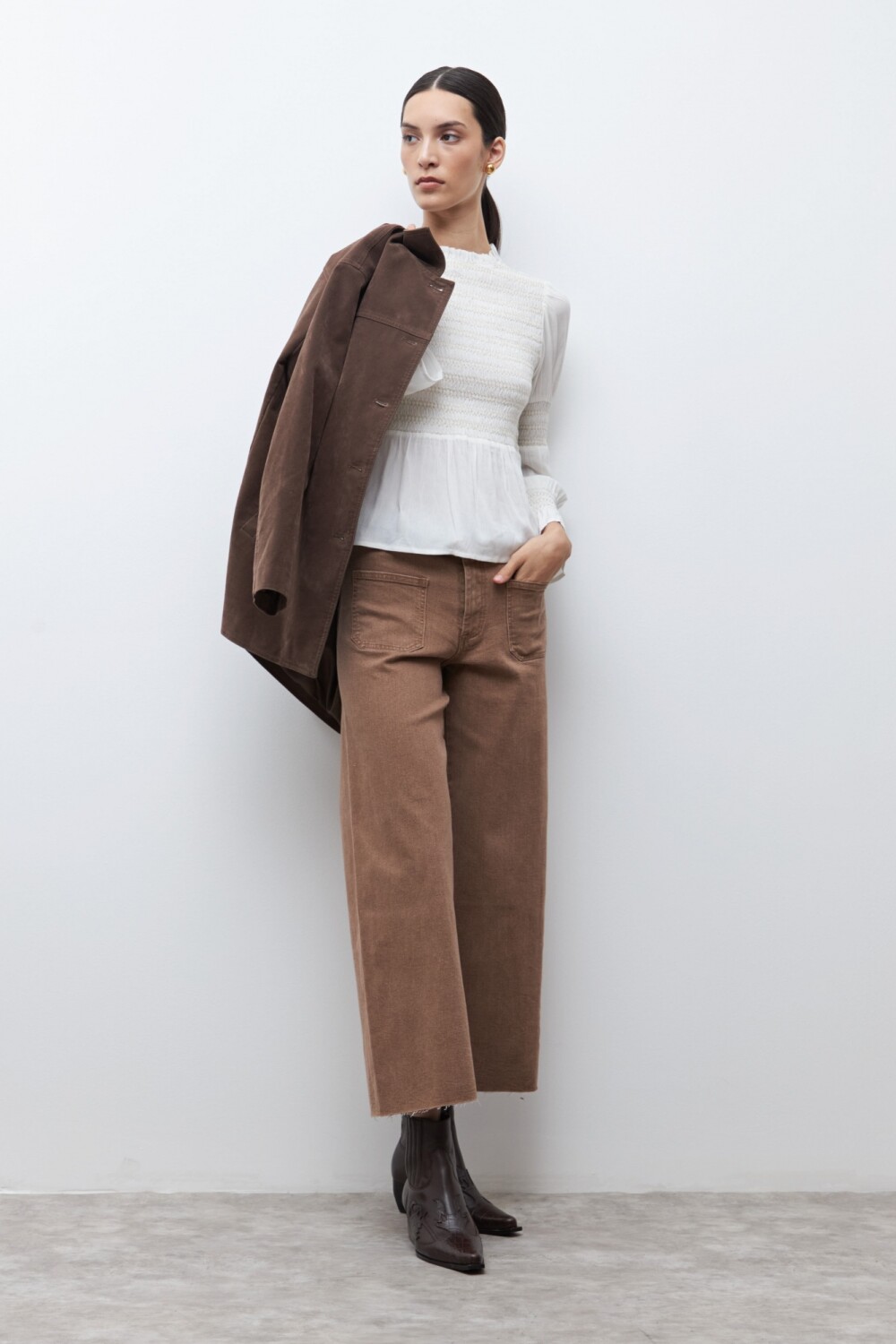 Blusa de escote a la base. Manga larga. Fruces en delantera y mangas.