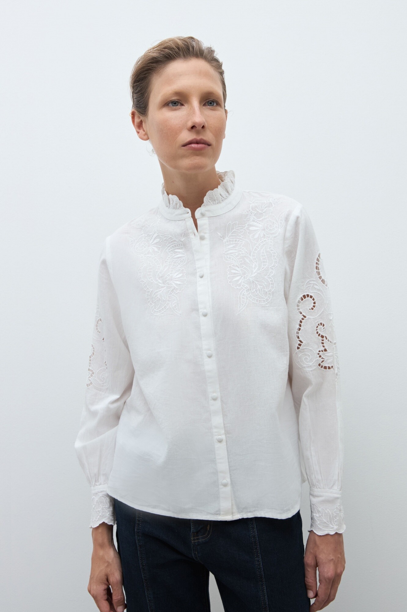Camisa de cuello subido con volados. Manga larga con bordados.