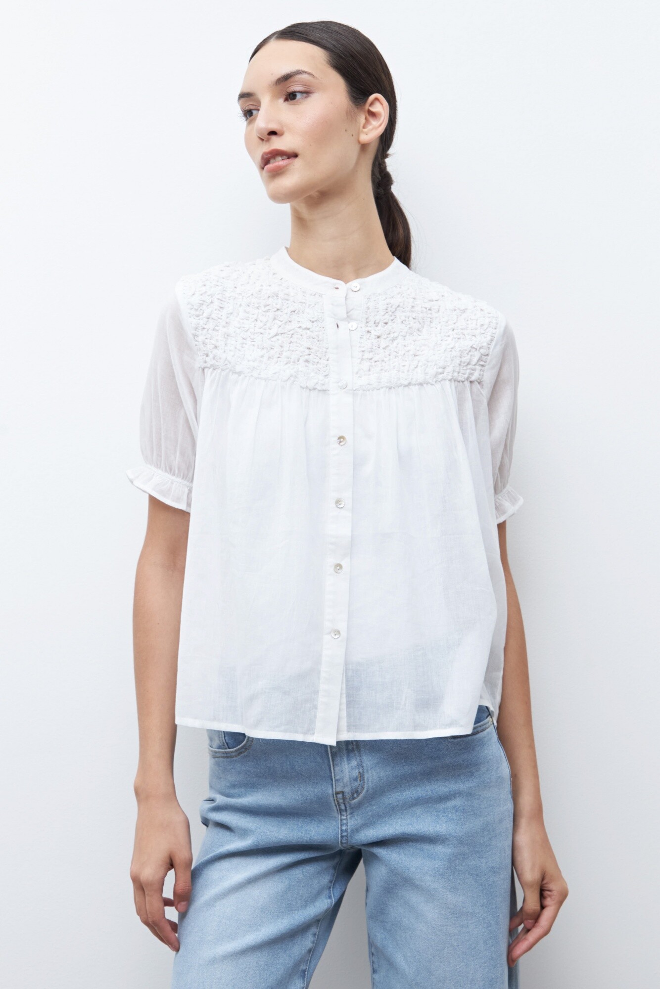 Camisa de escote a la base. Manga corta acabada en volados. Frunces en delantera.