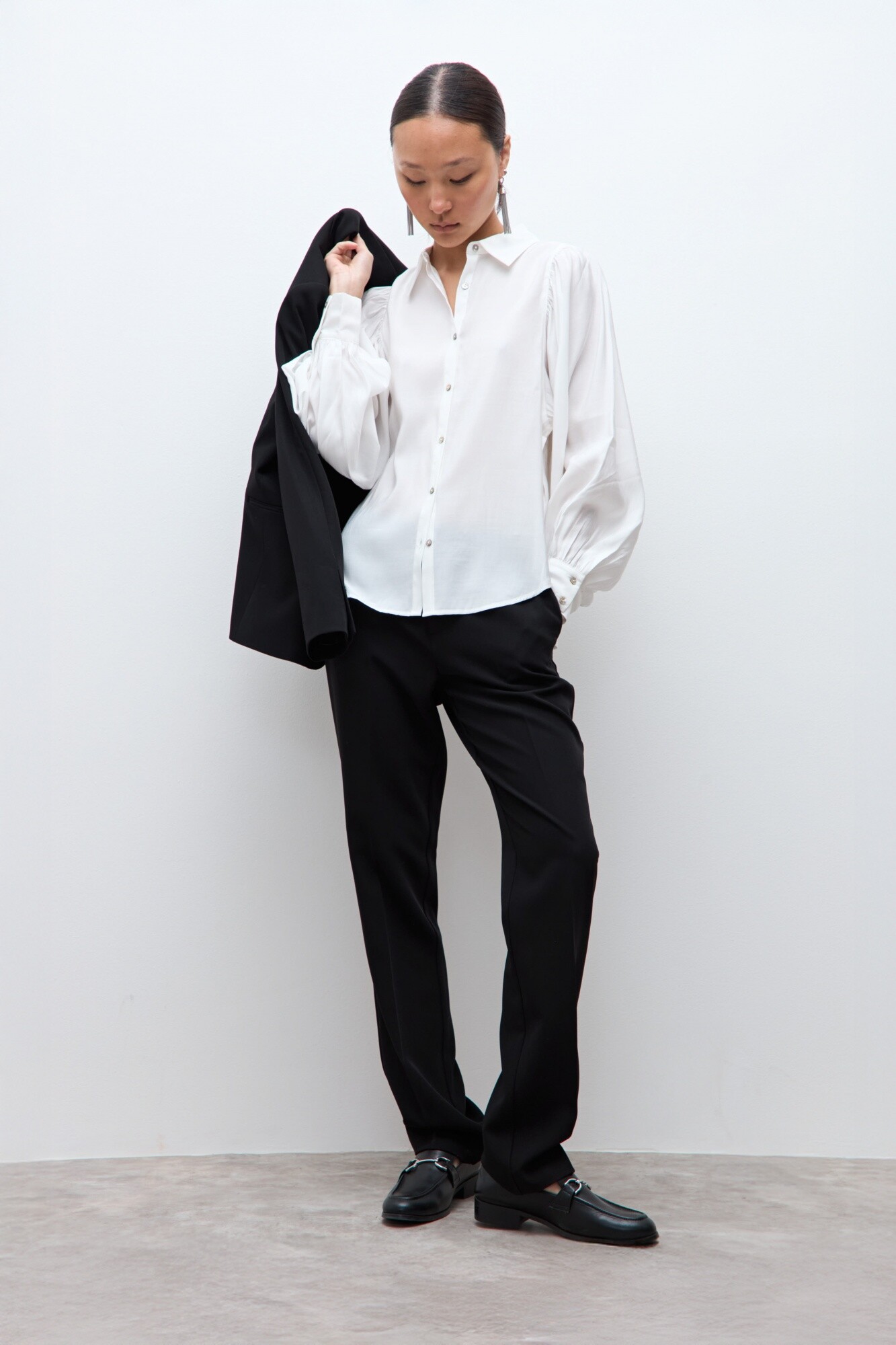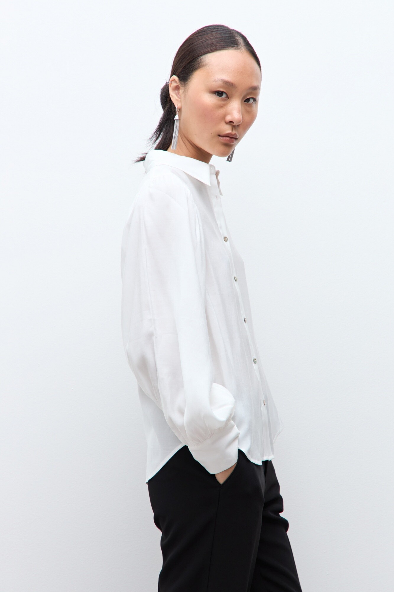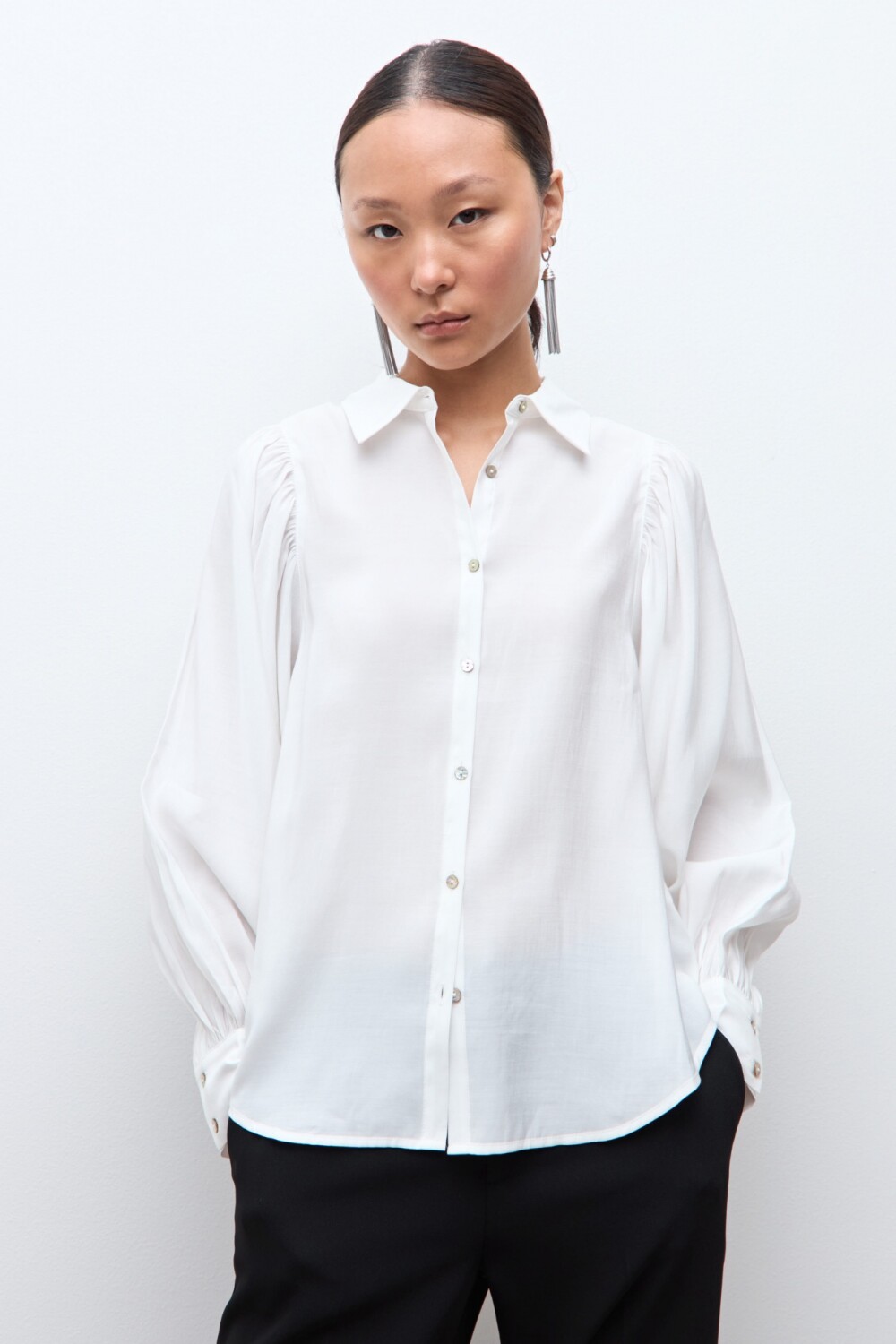 Camisa de cuello camisero. Manga larga abullonada.