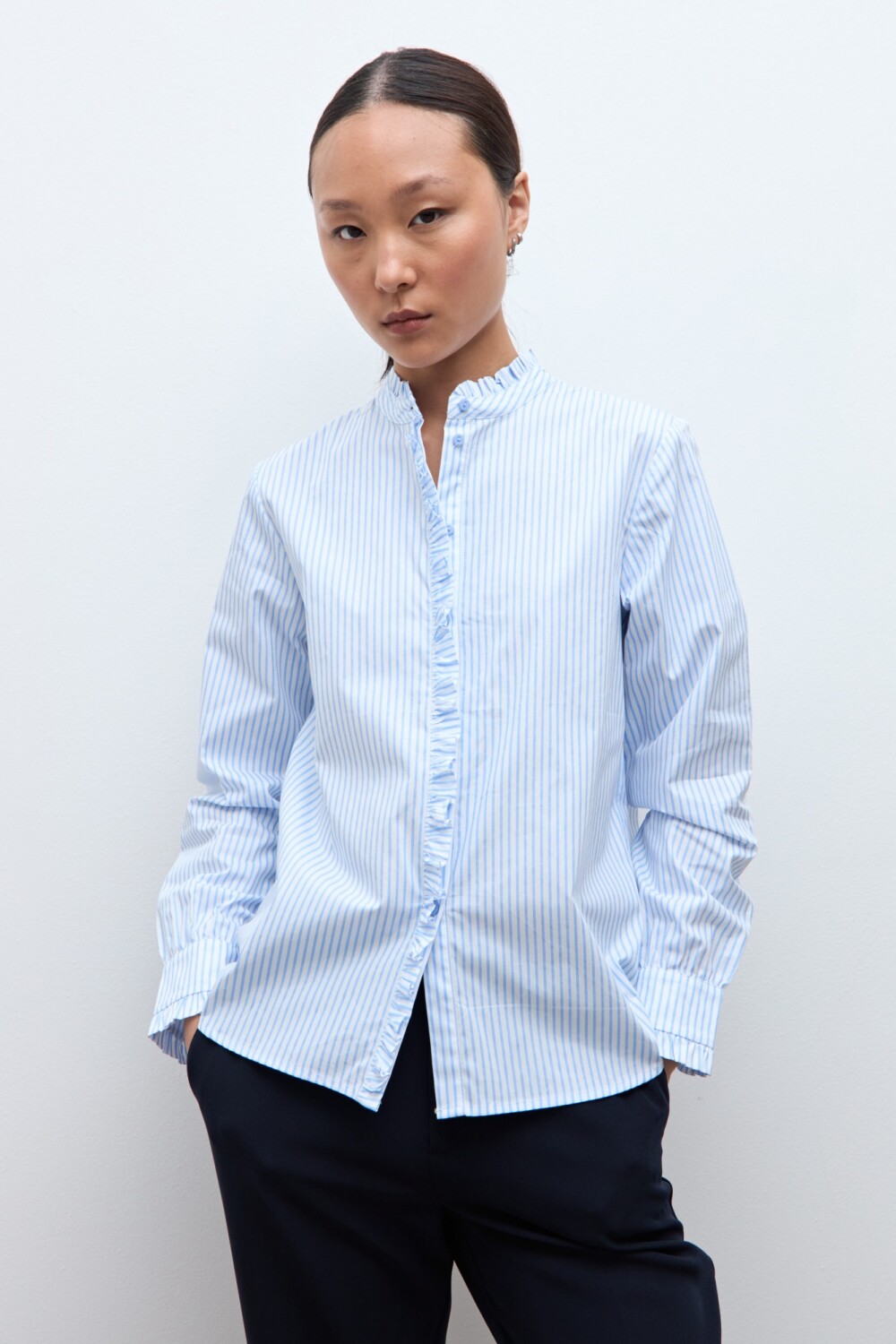 Camisa de cuello mao. Manga larga. Volado en cartera.