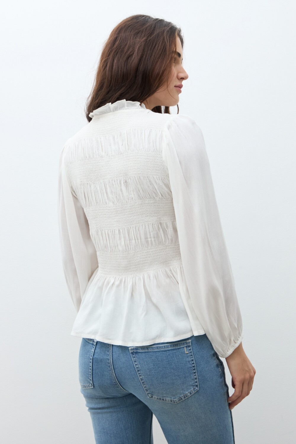 Camisa de cuello subido con manga larga. Frunces en delantera.
