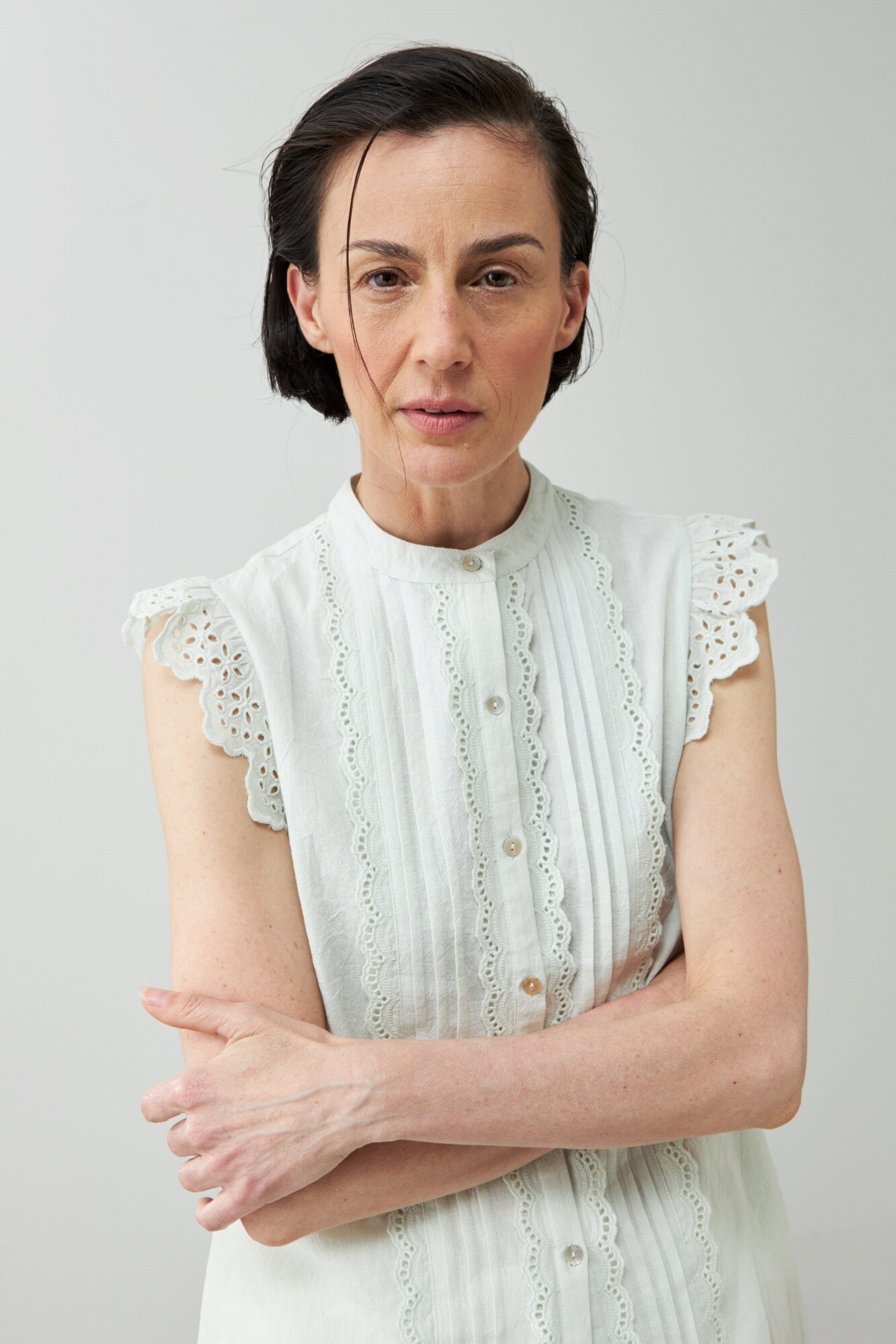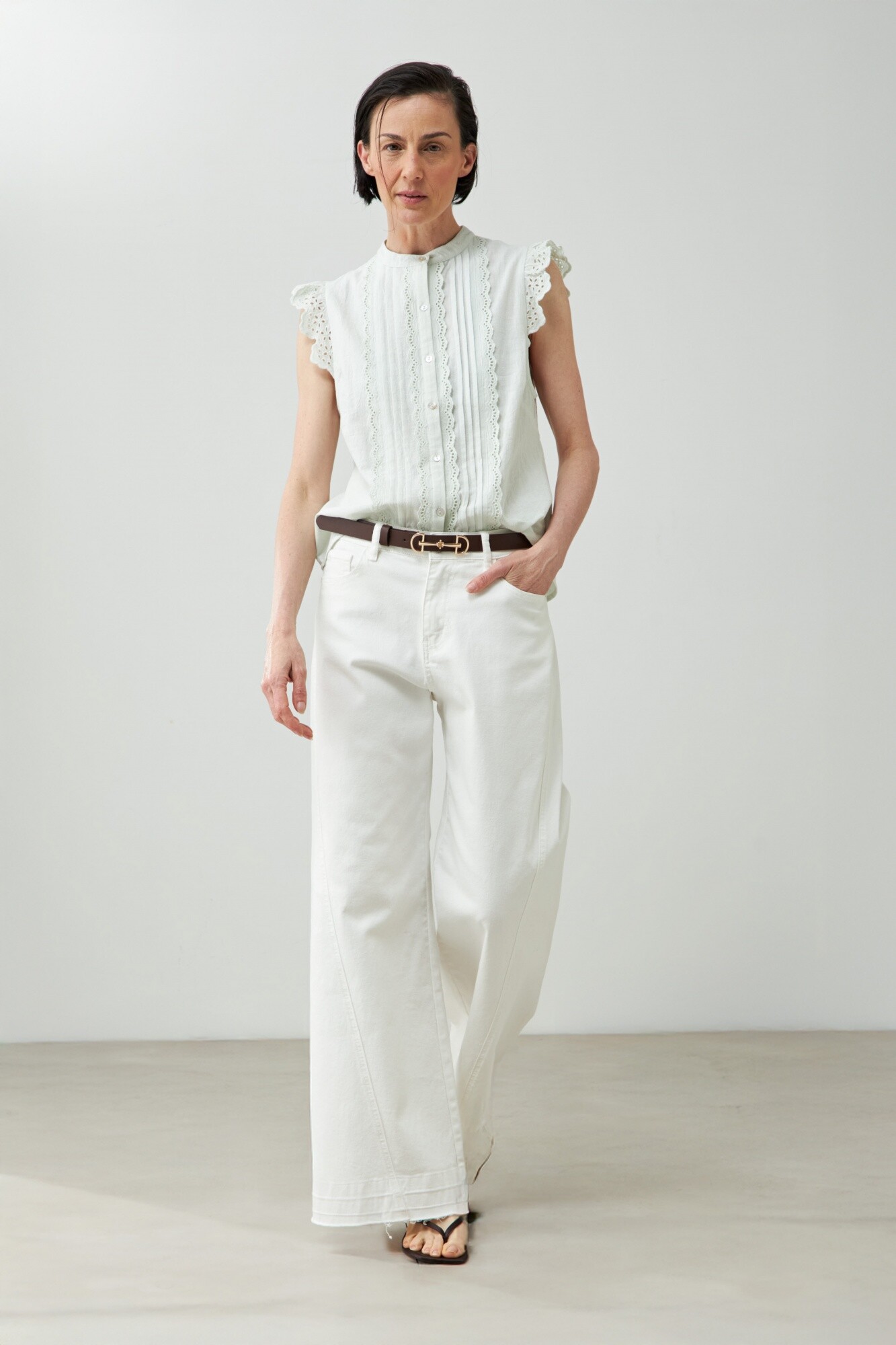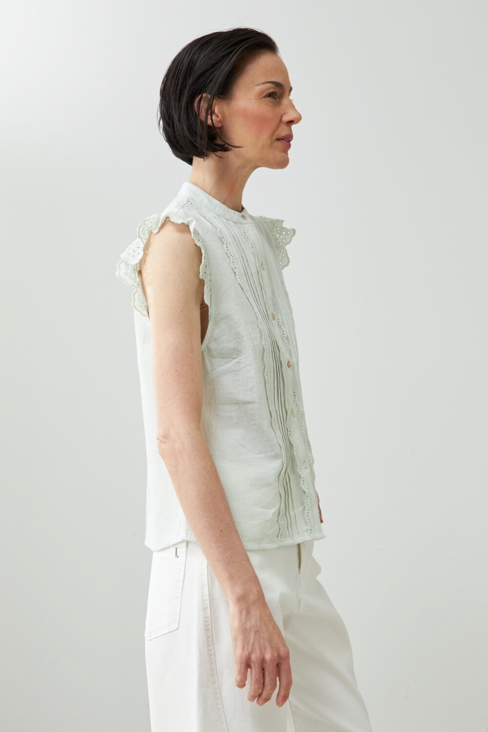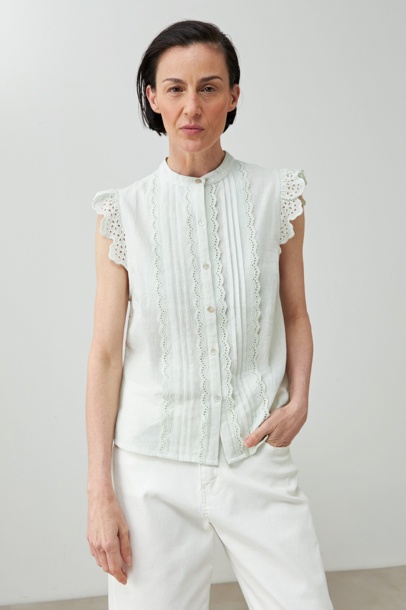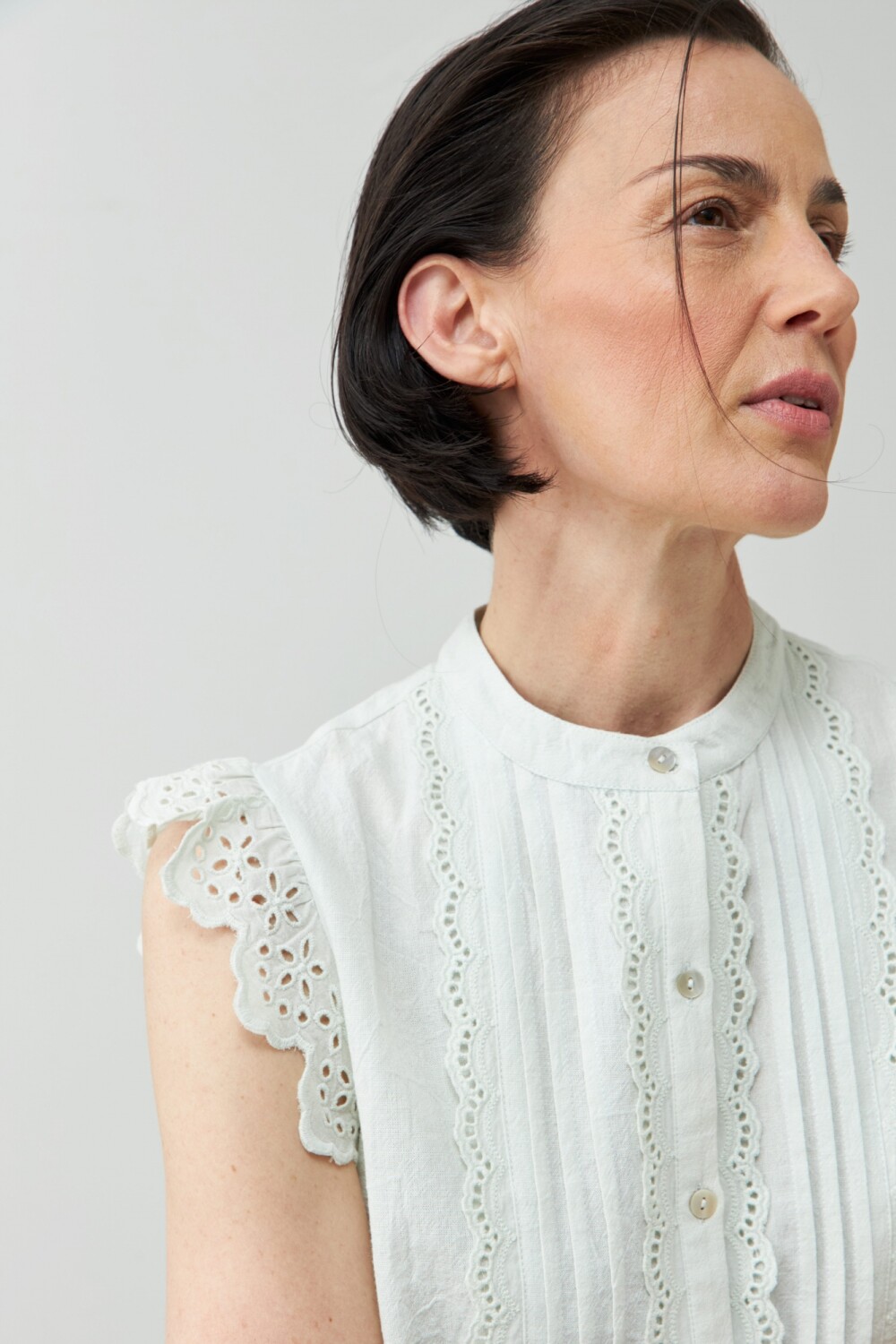 Camisa sin mangas de estilo romántico con puntillas y alforzas.