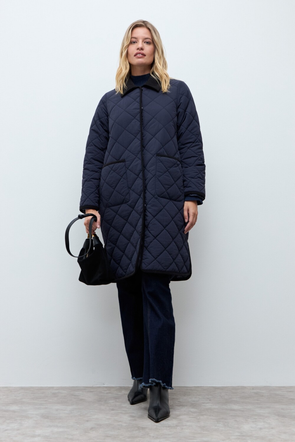 Campera larga con cuello en pana. Capitoneado. Manga larga. Bolsillos delanteros. Botones a presión.