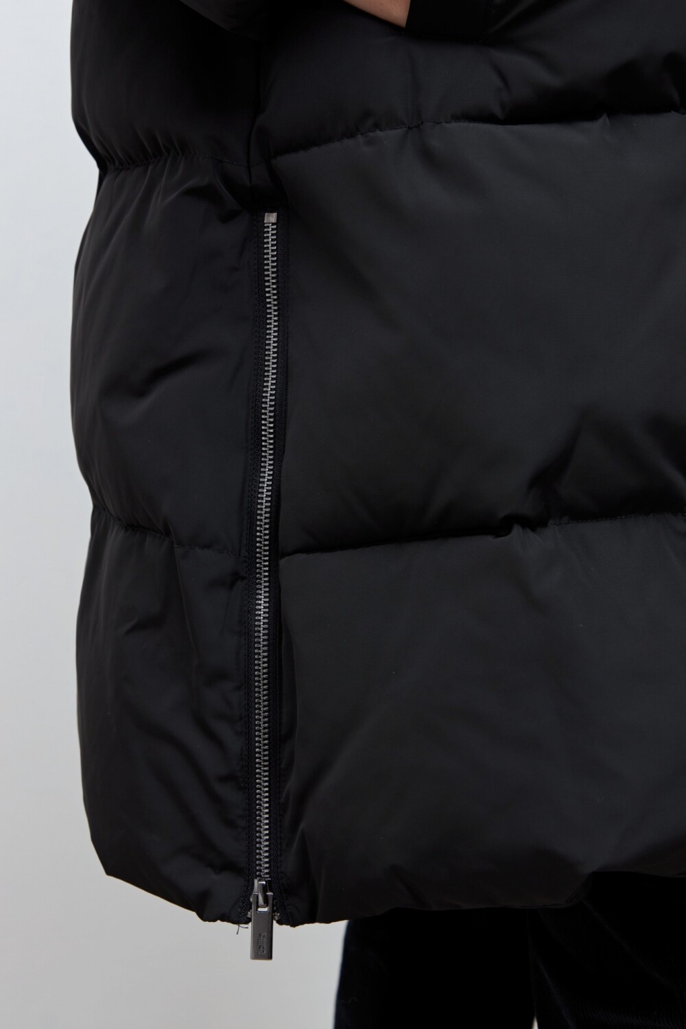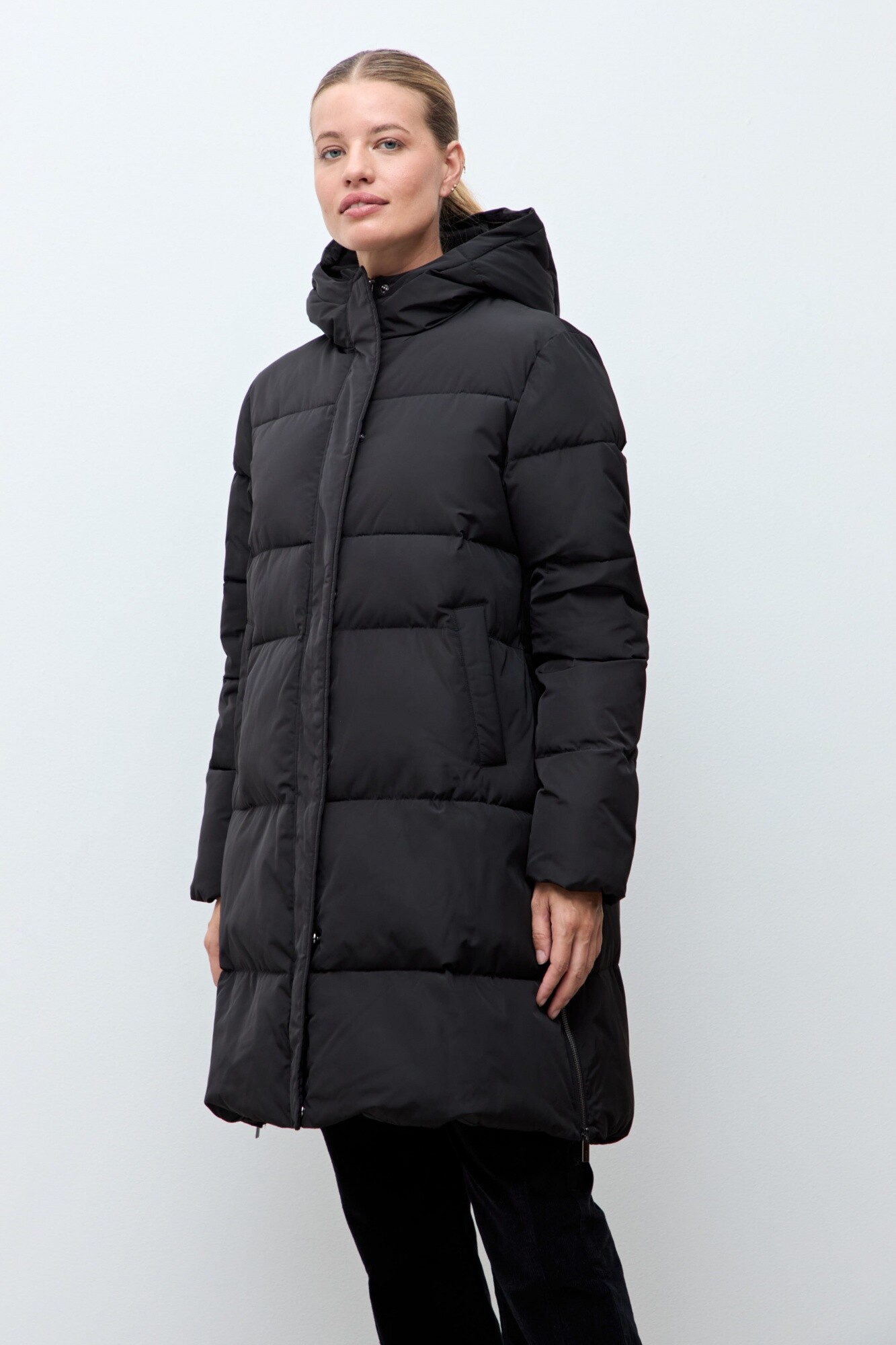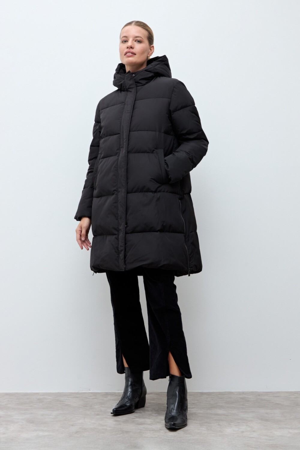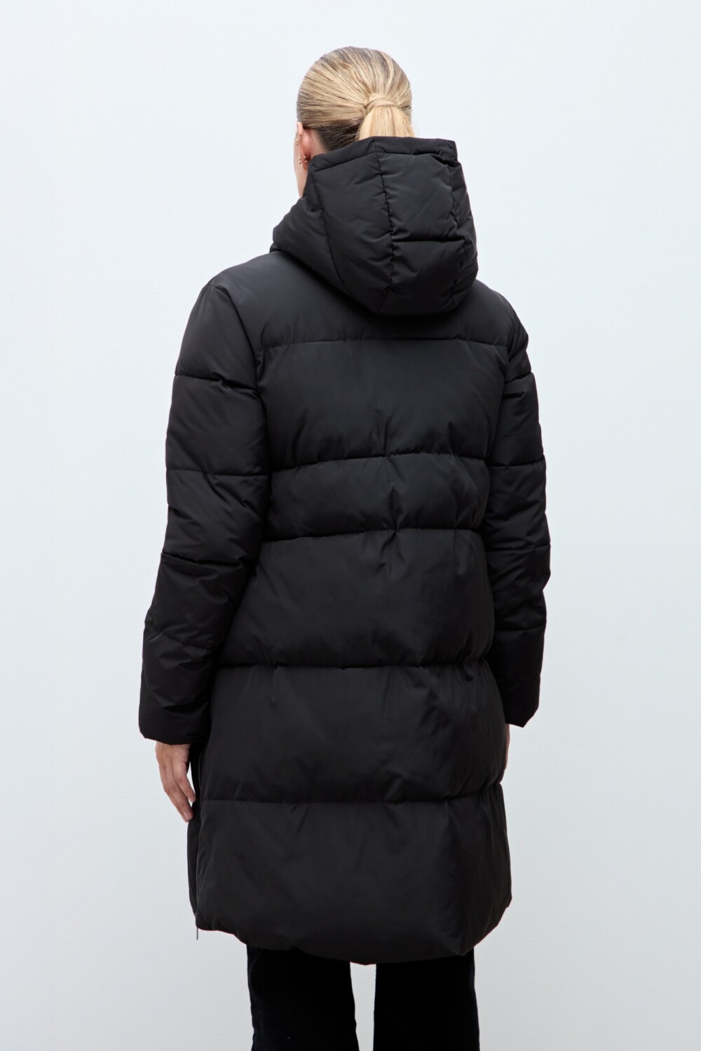 Campera larga con cuello alto. Capucha. Manga larga. Bolsillos laterales.