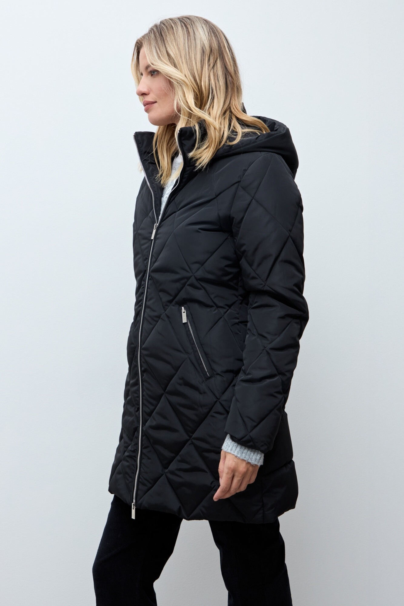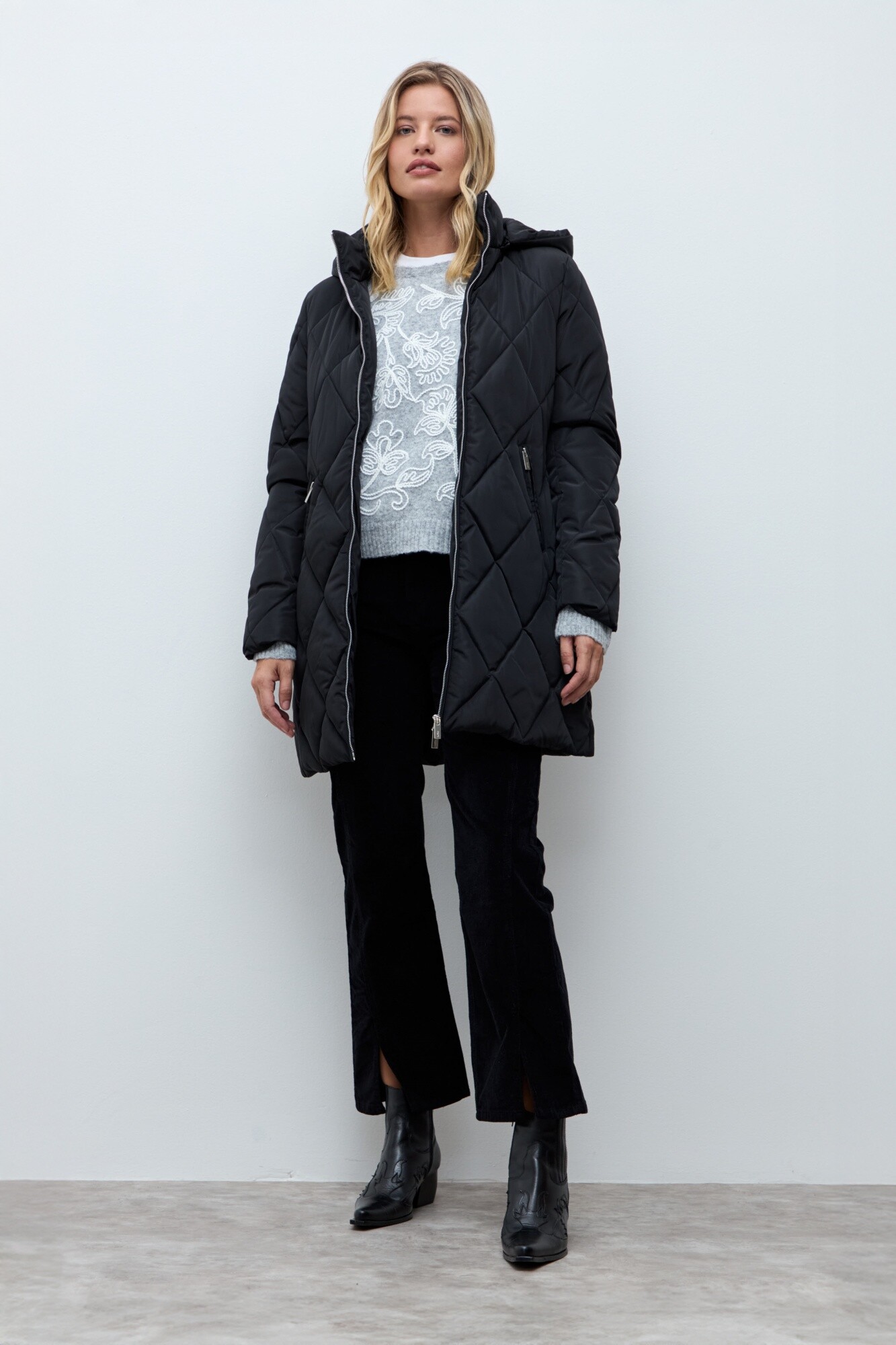 Campera larga con cuello alto. Capucha. Manga larga. Bolsillos laterales.