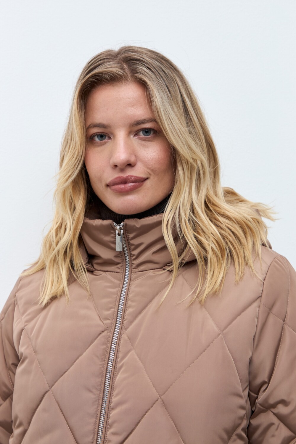 Campera larga con cuello alto. Capucha. Manga larga. Bolsillos laterales.