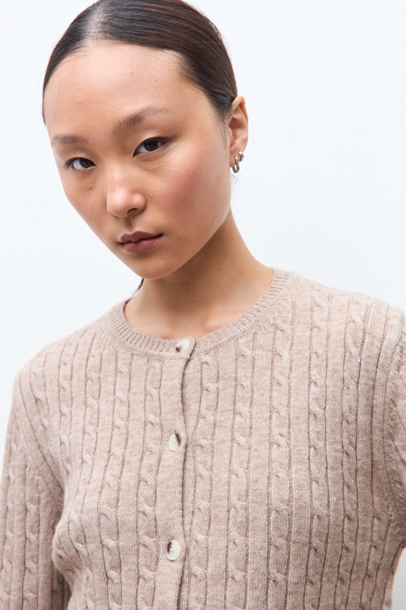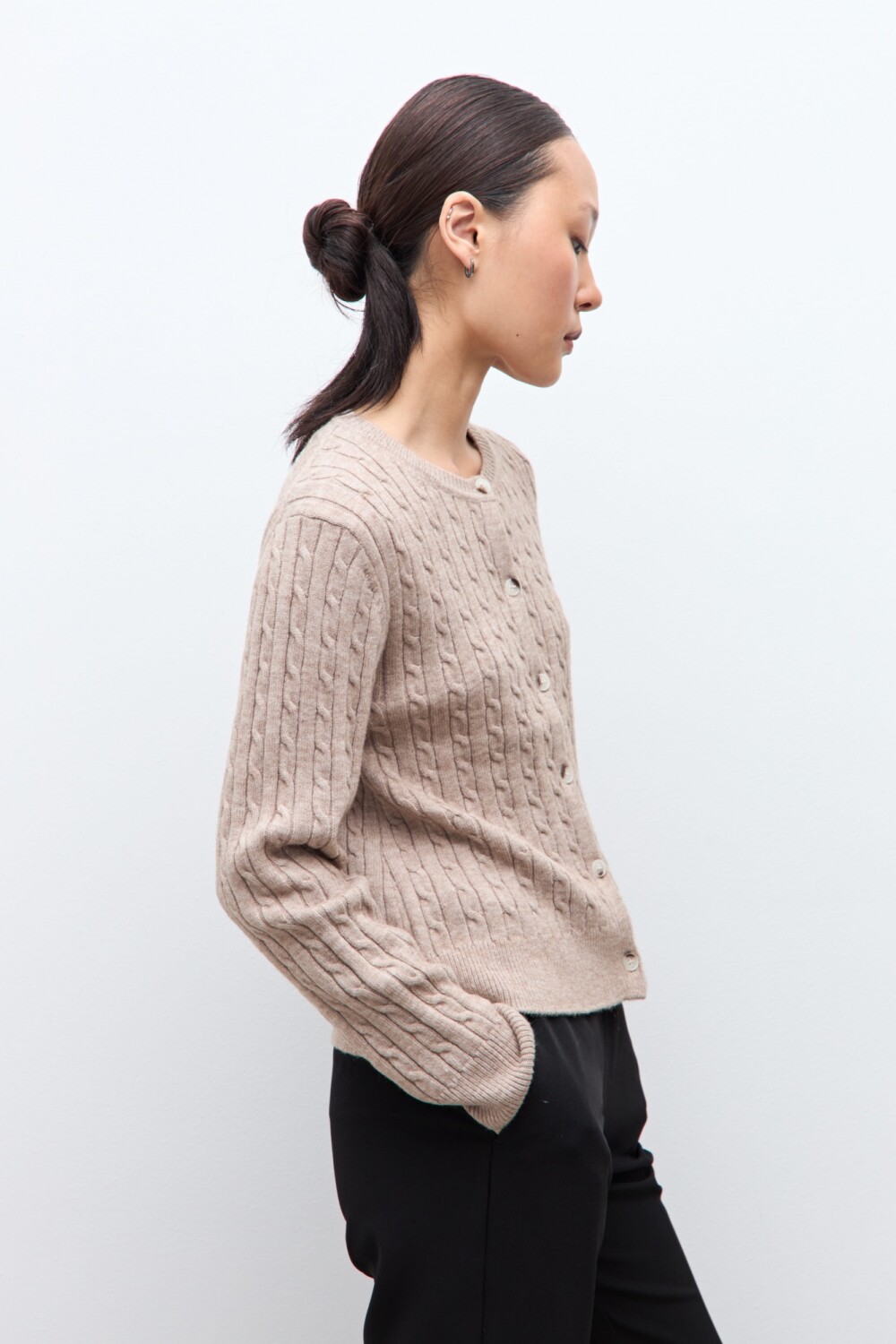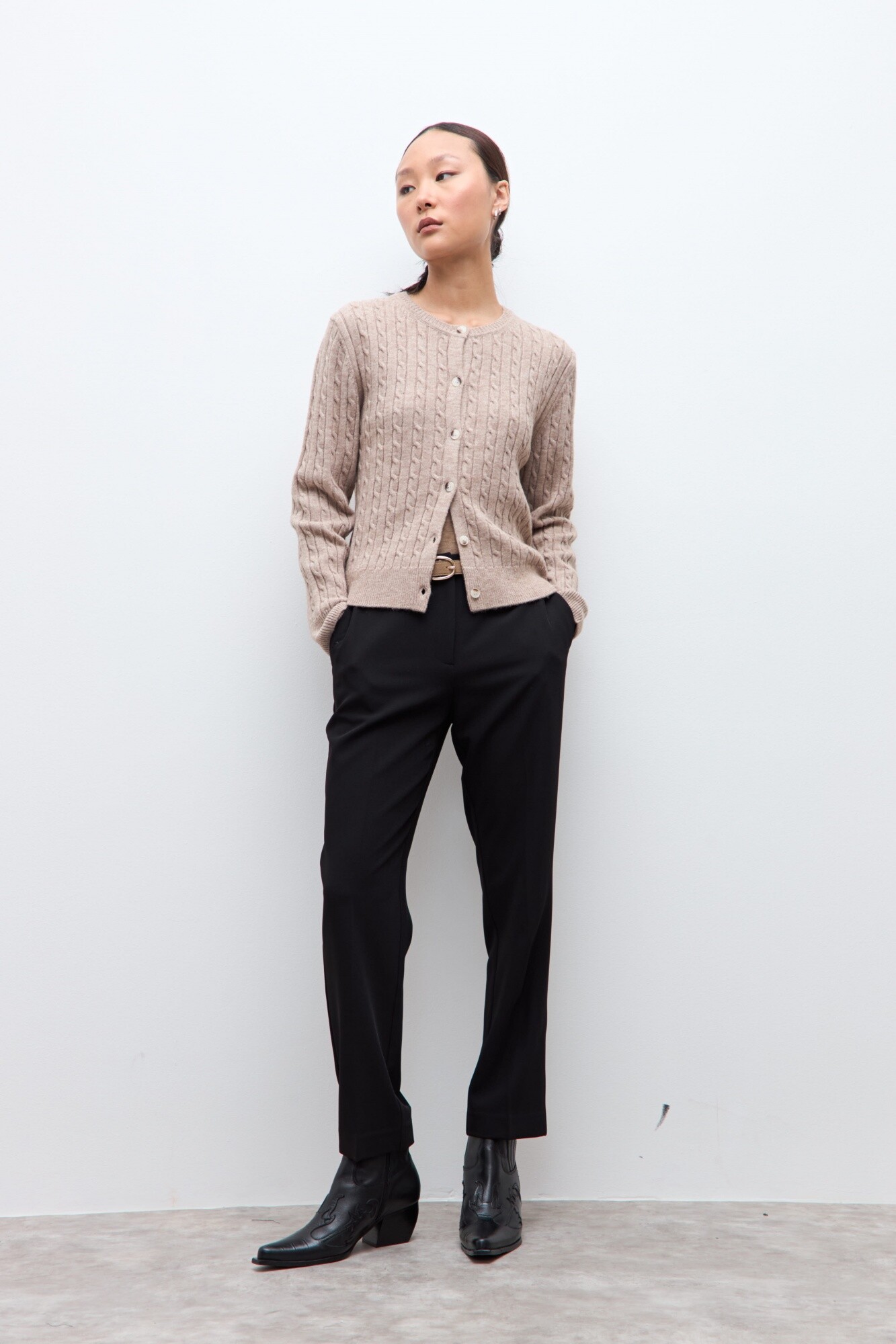 Cardigan tejido con estructura. Escote a la base. Manga larga.