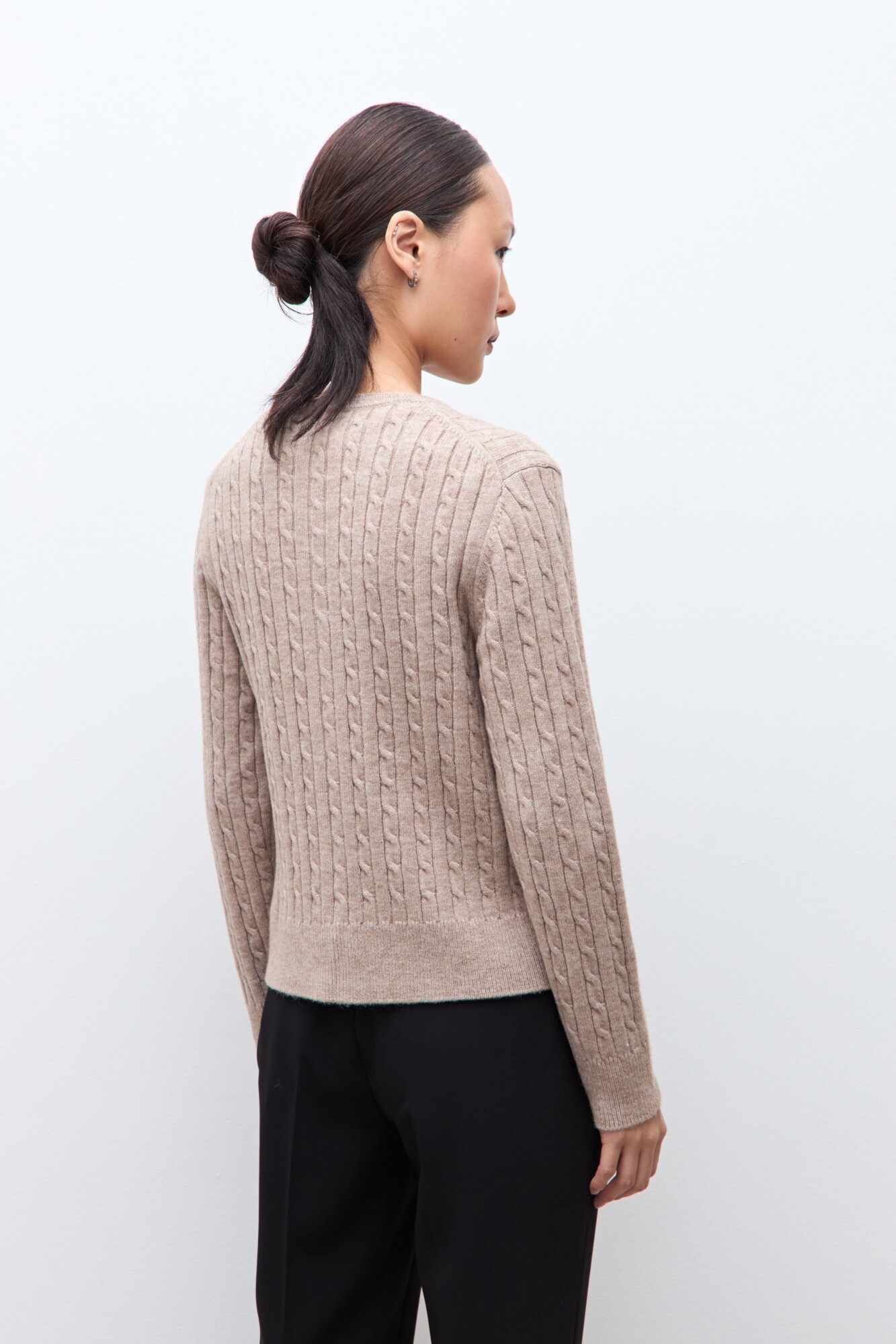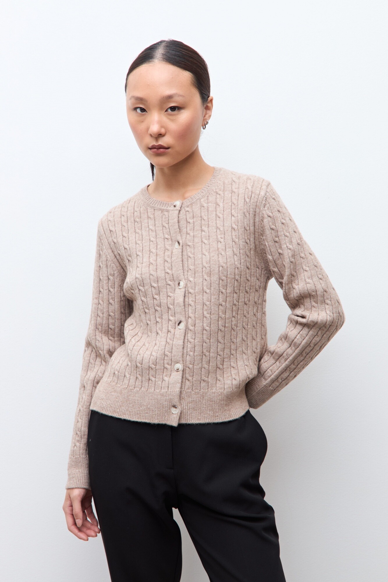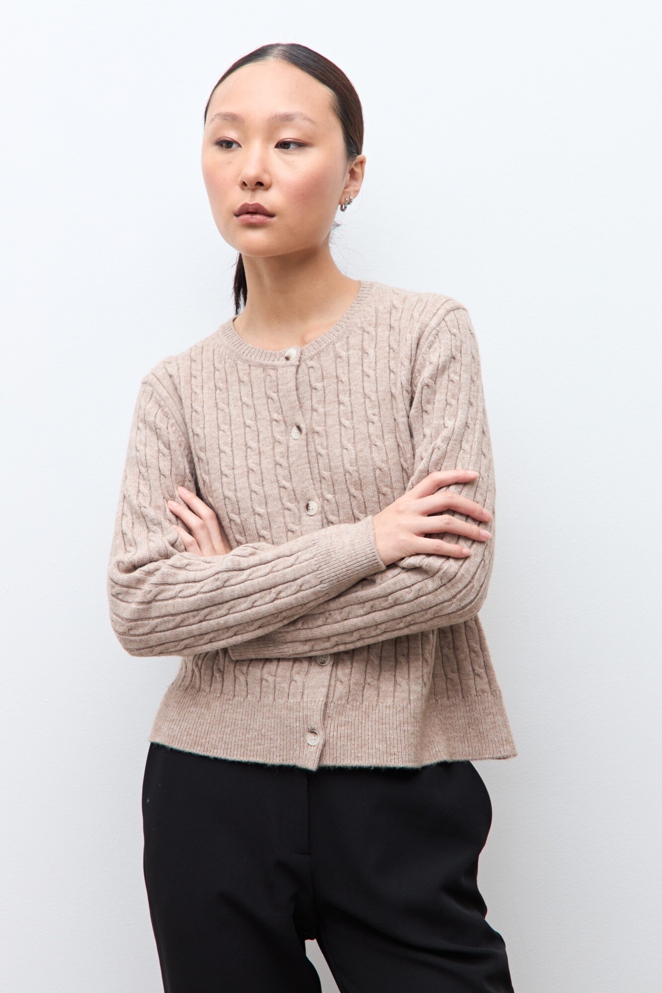 Cardigan tejido con estructura. Escote a la base. Manga larga.