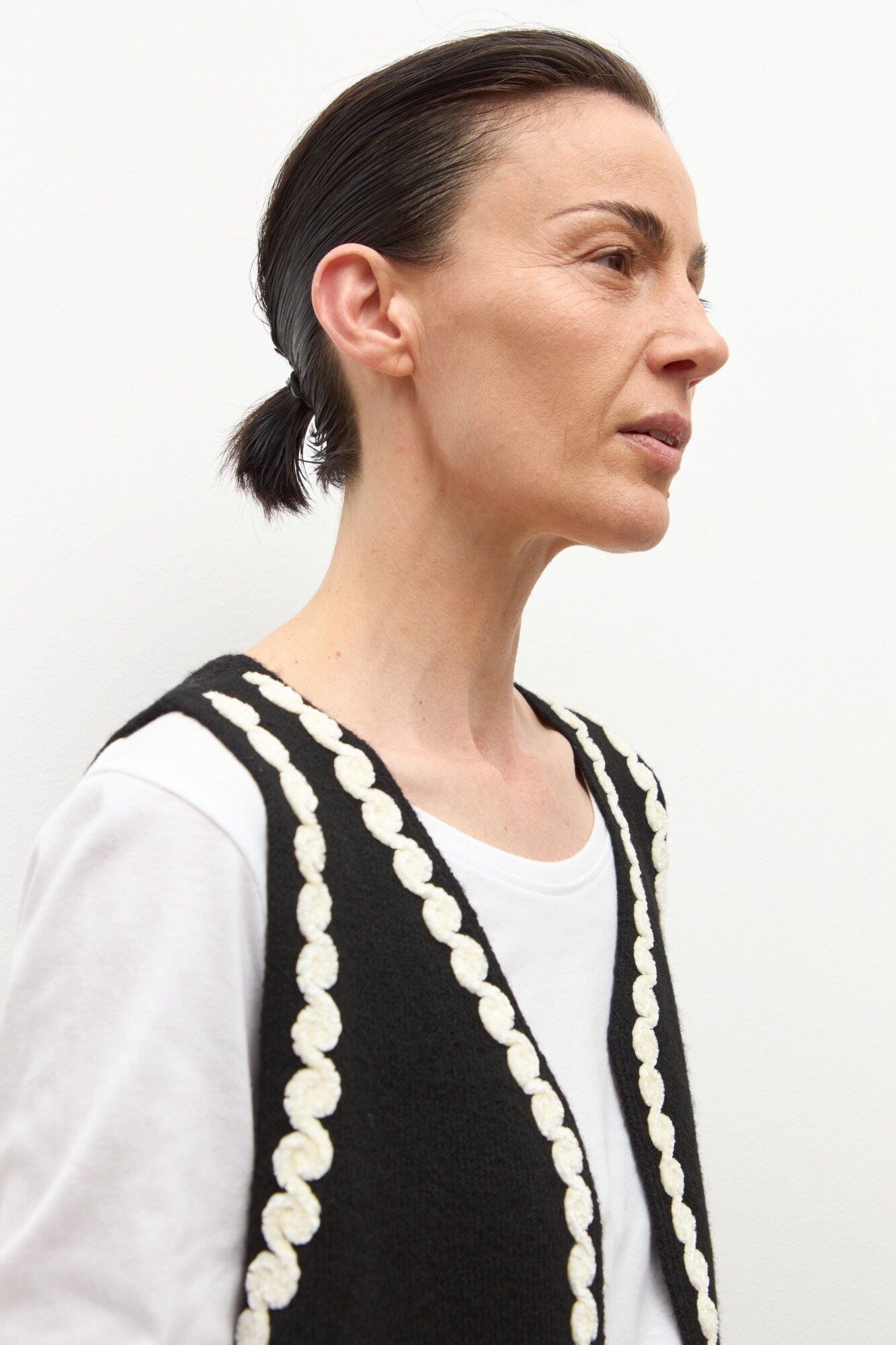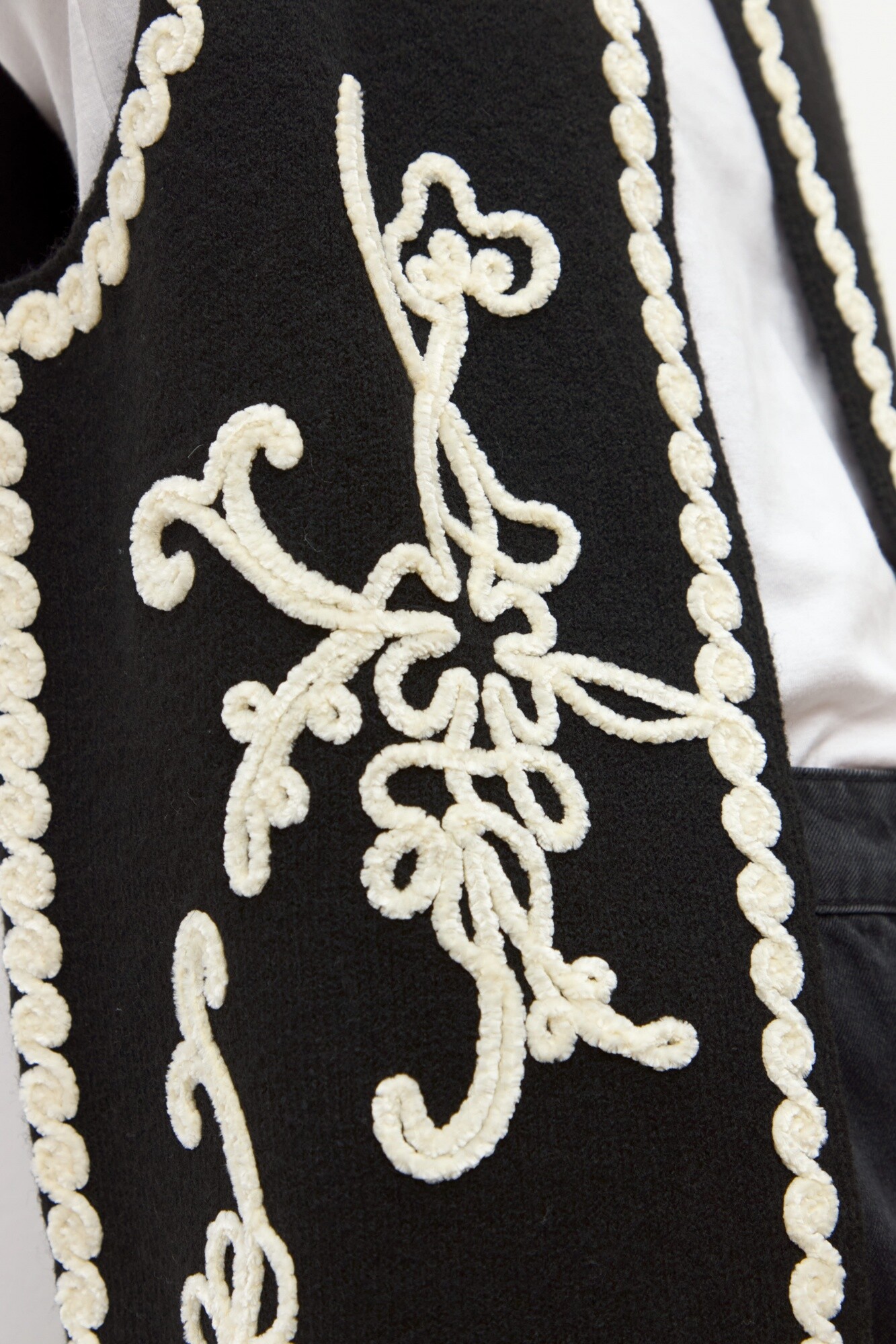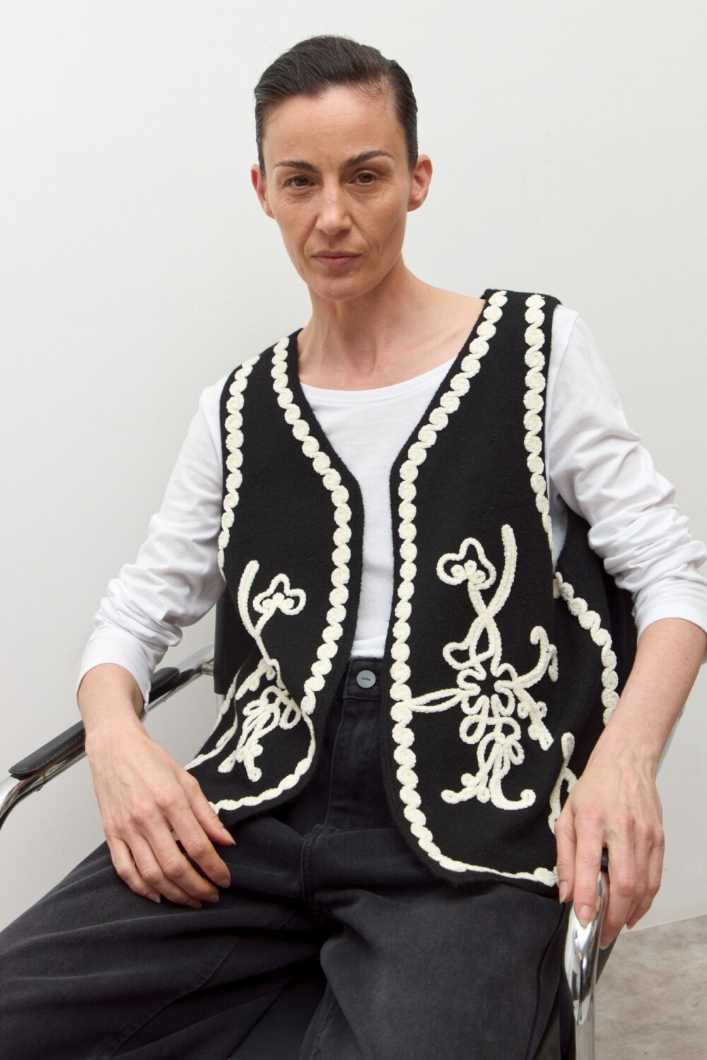 Chaleco tejido con apliques bordados a contratono.