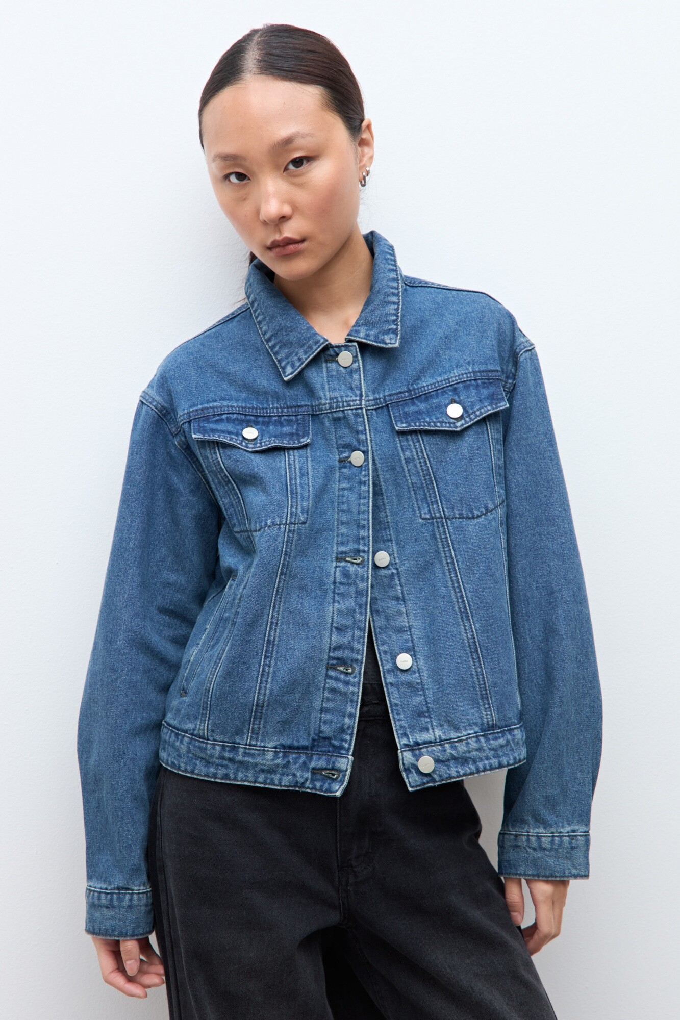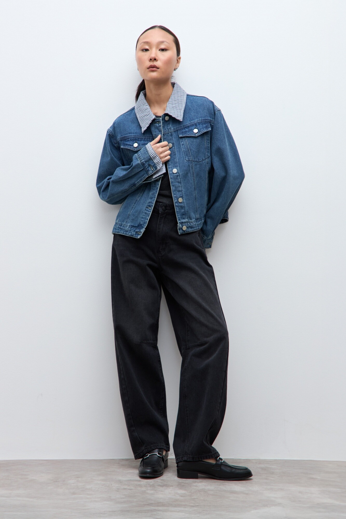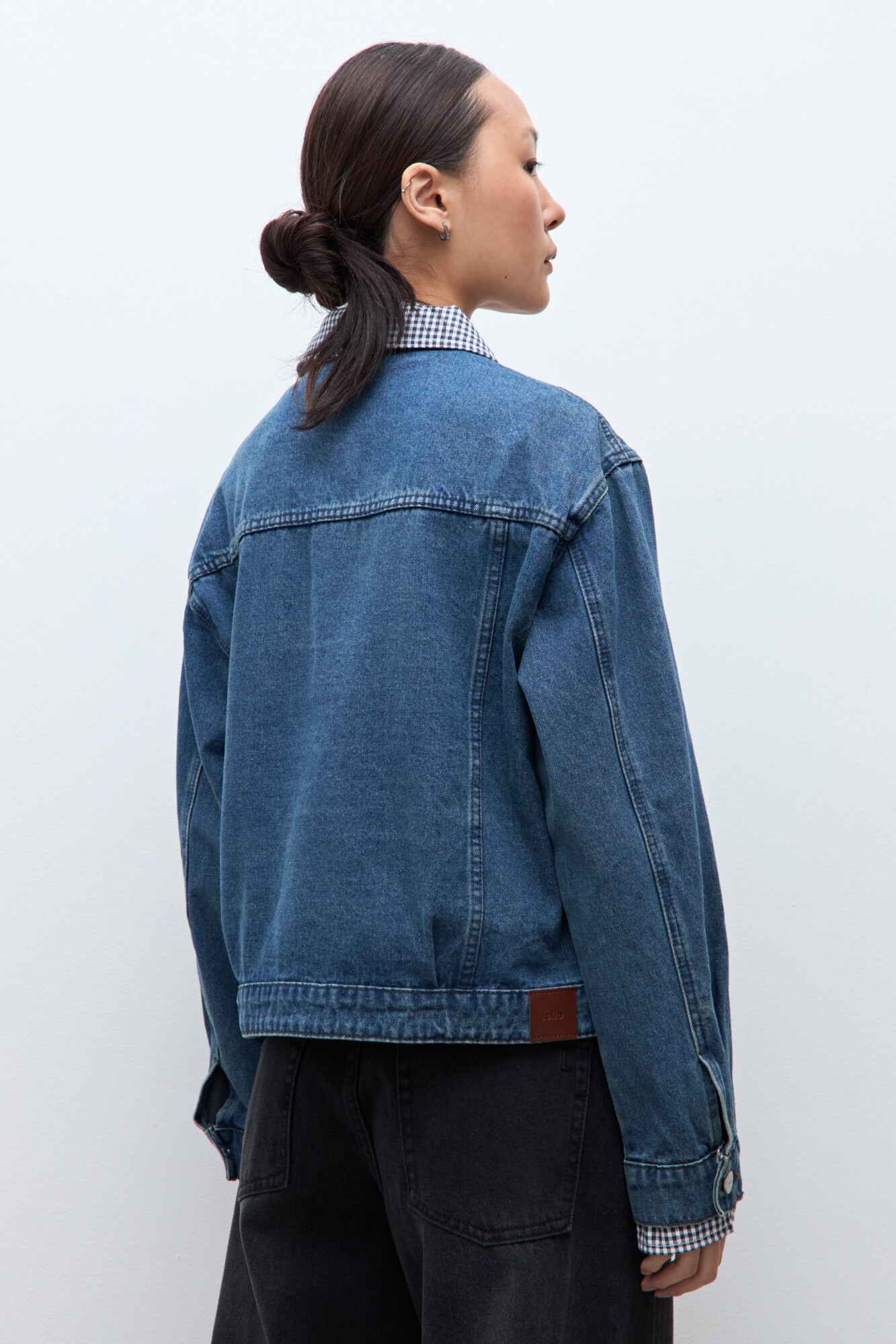 Chaqueta de jean clásica. Detalle desmontable vichy en cuello y puños.