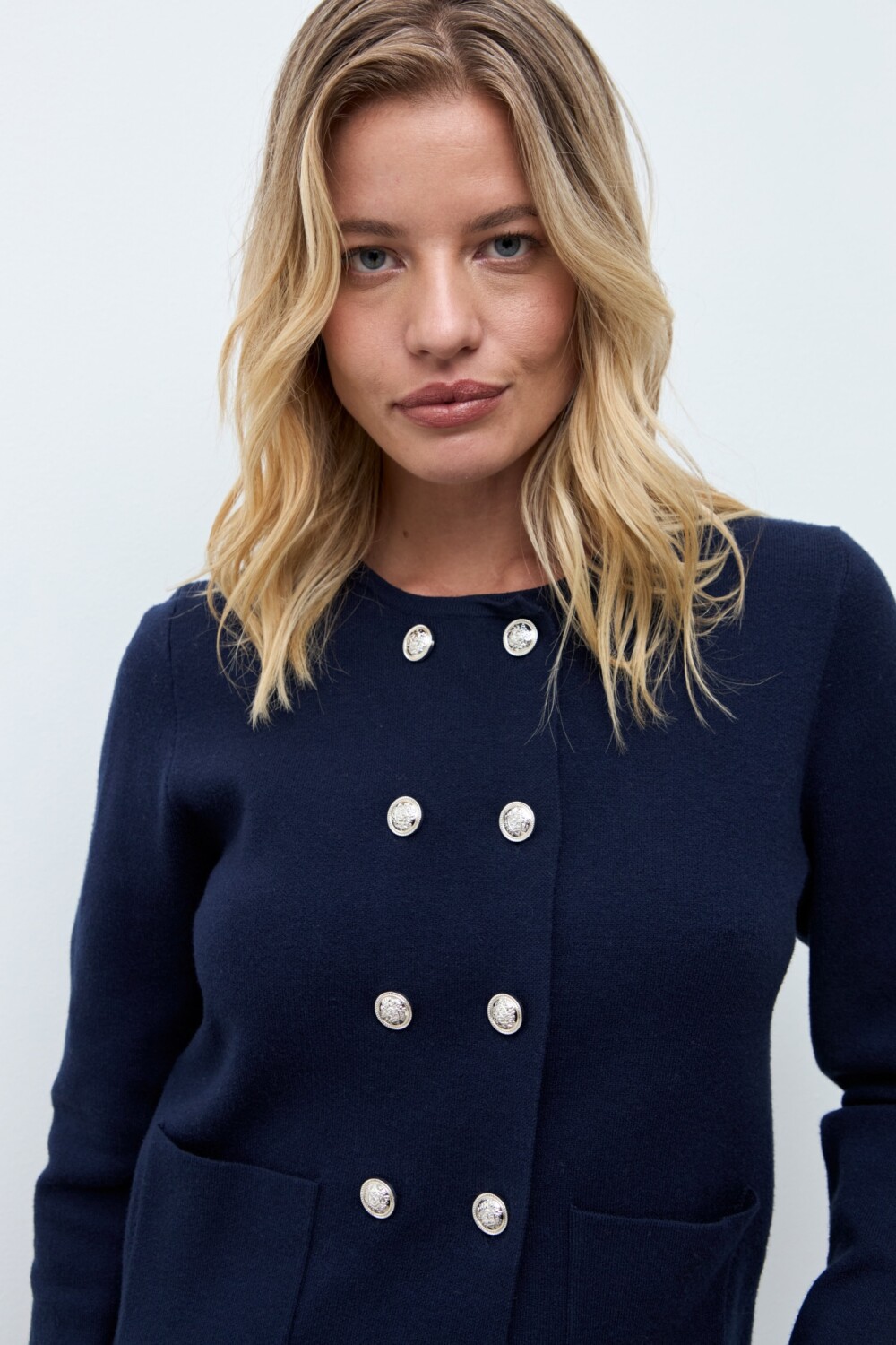 Chaqueta tejida con cuello alto desmontable. Manga larga. Botones metálicos.