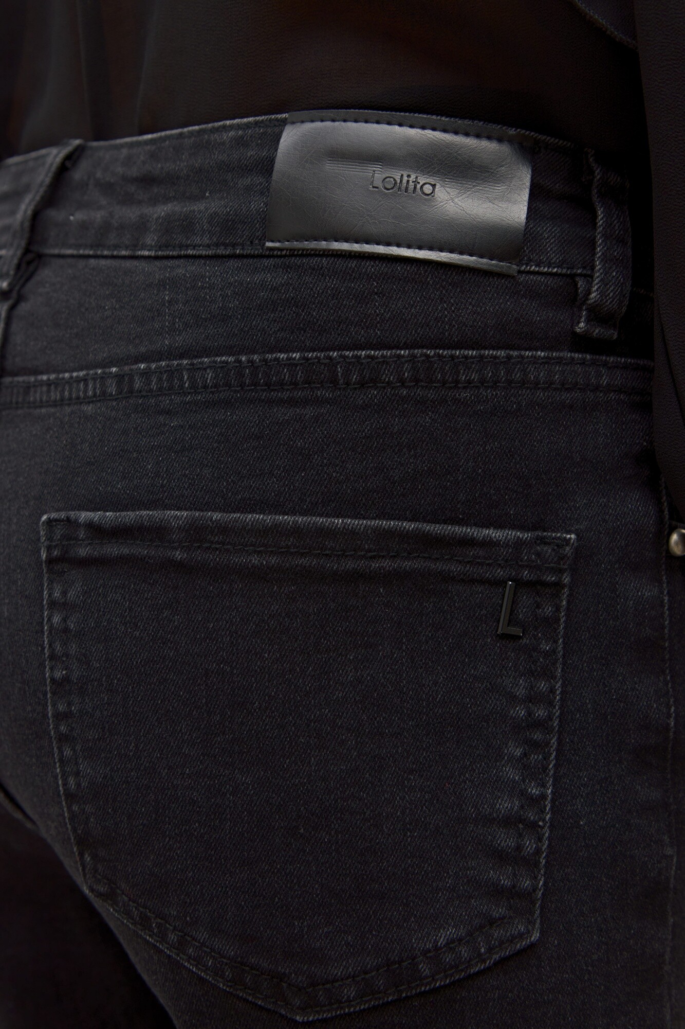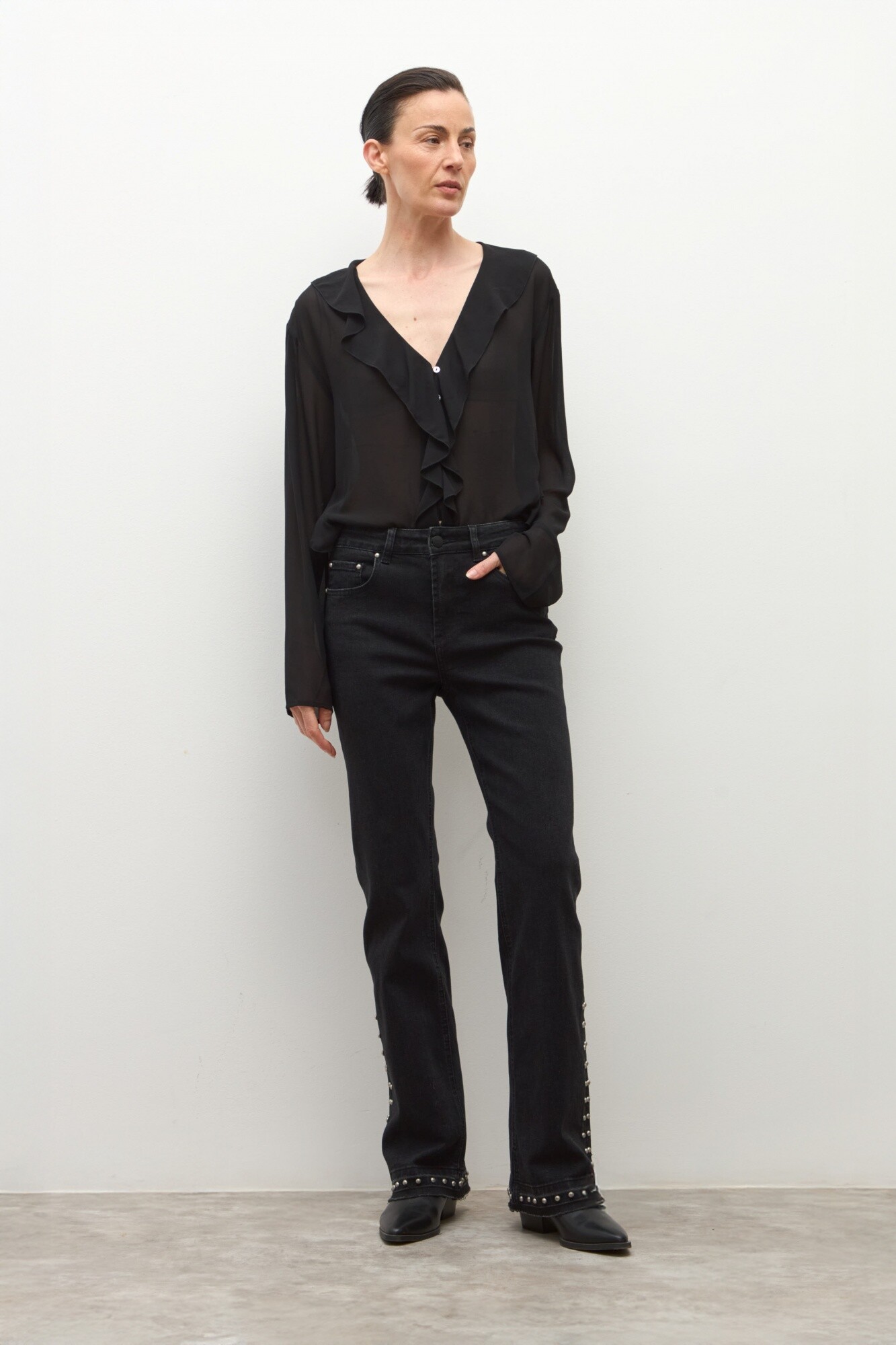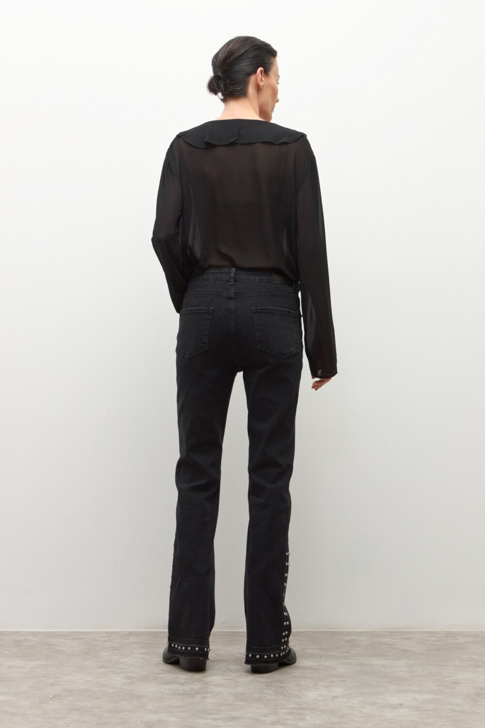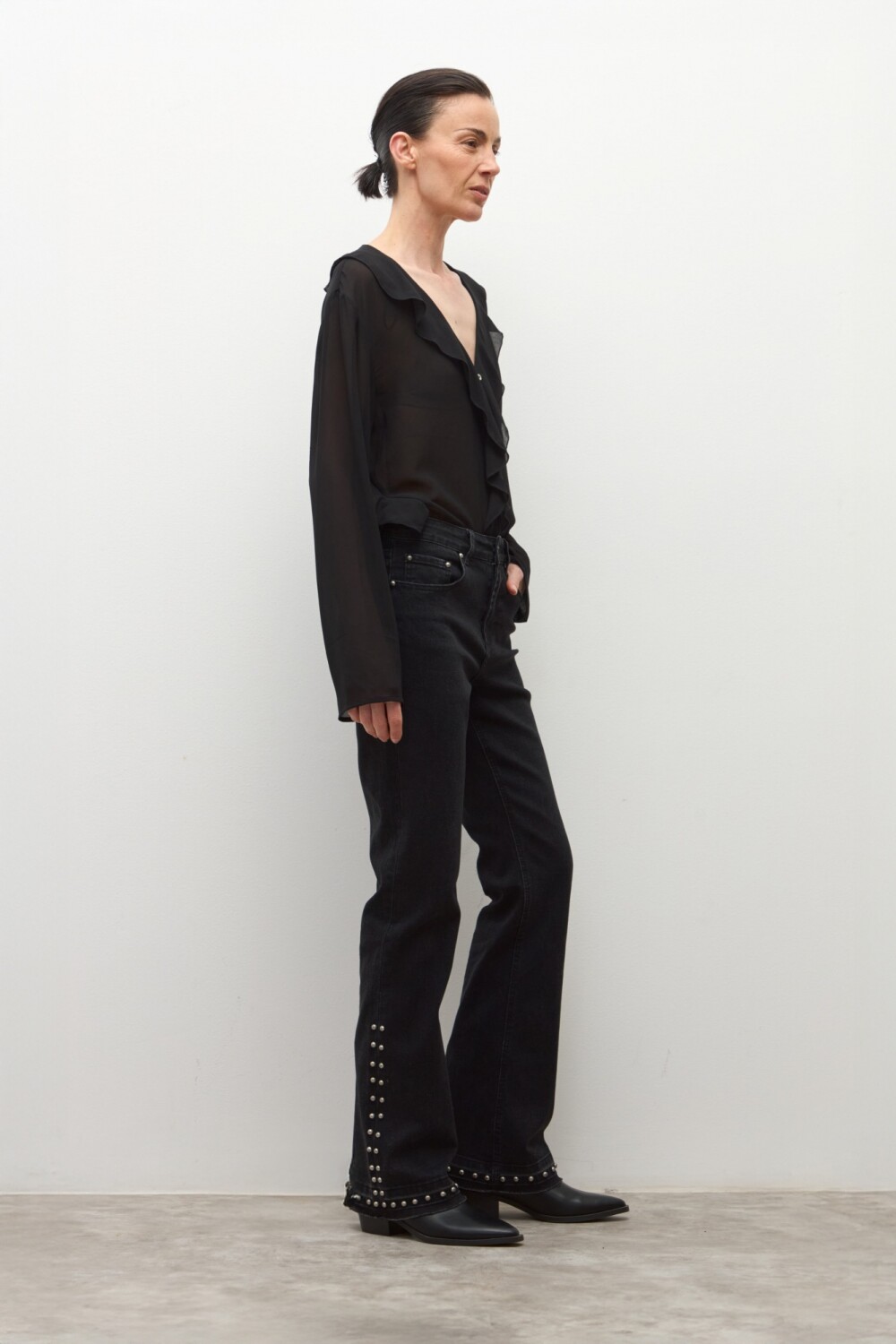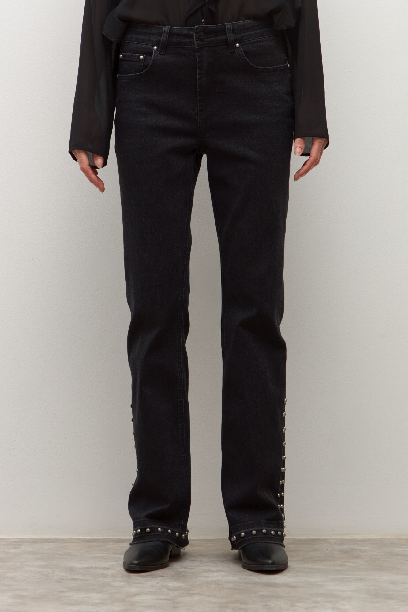 Jean bootcut de tiro alto. Detalle de tachas en laterales y bajo.
