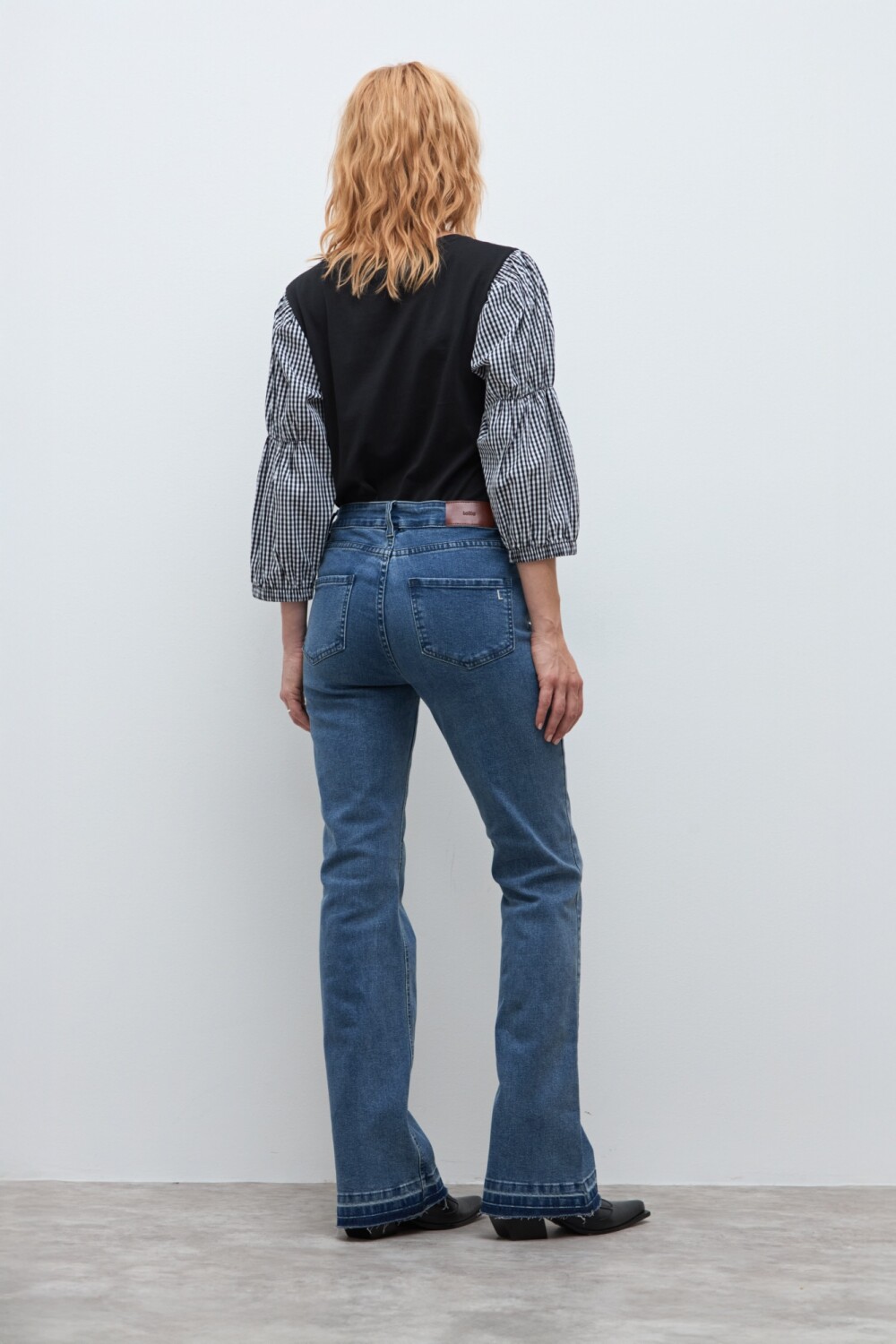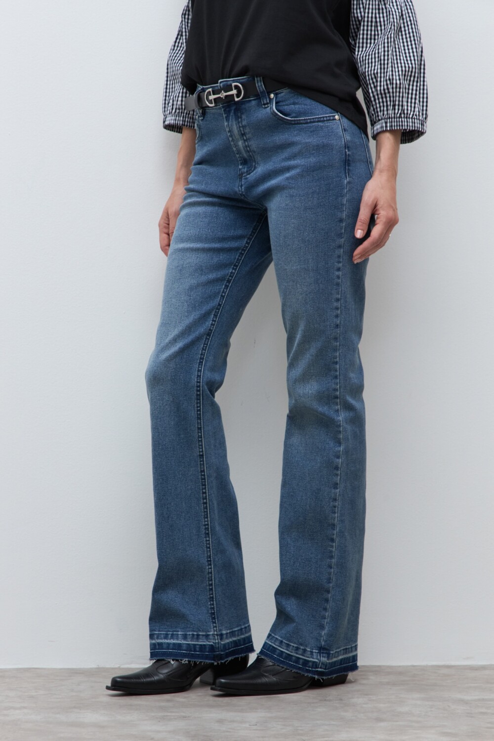 Jean bootcut de tiro alto. Bajo desflecado.