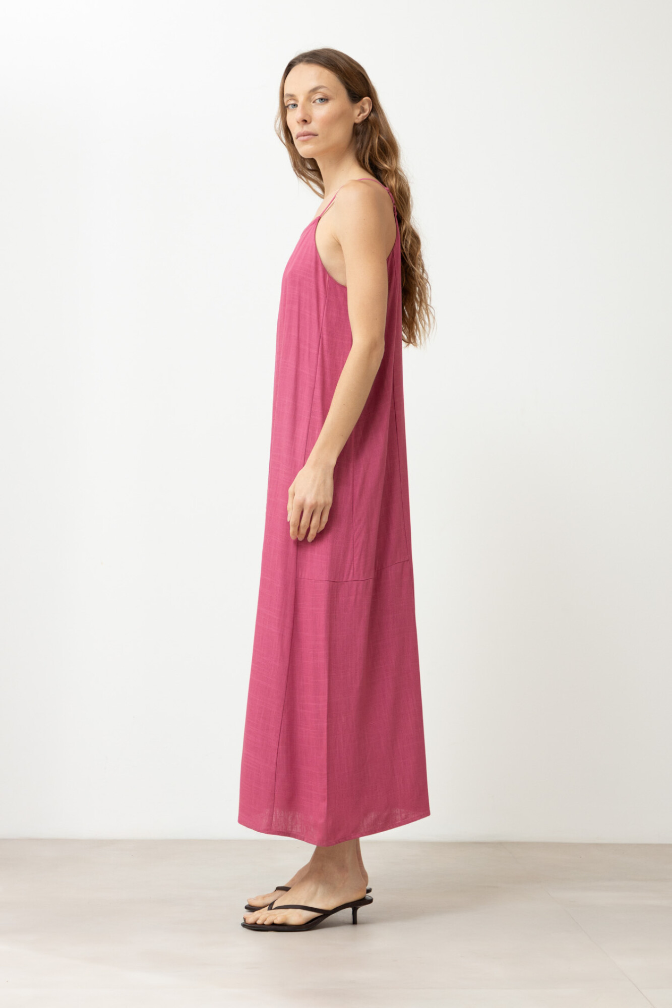 Vestido de escote recto con breteles finos. Alforzas en delantera.