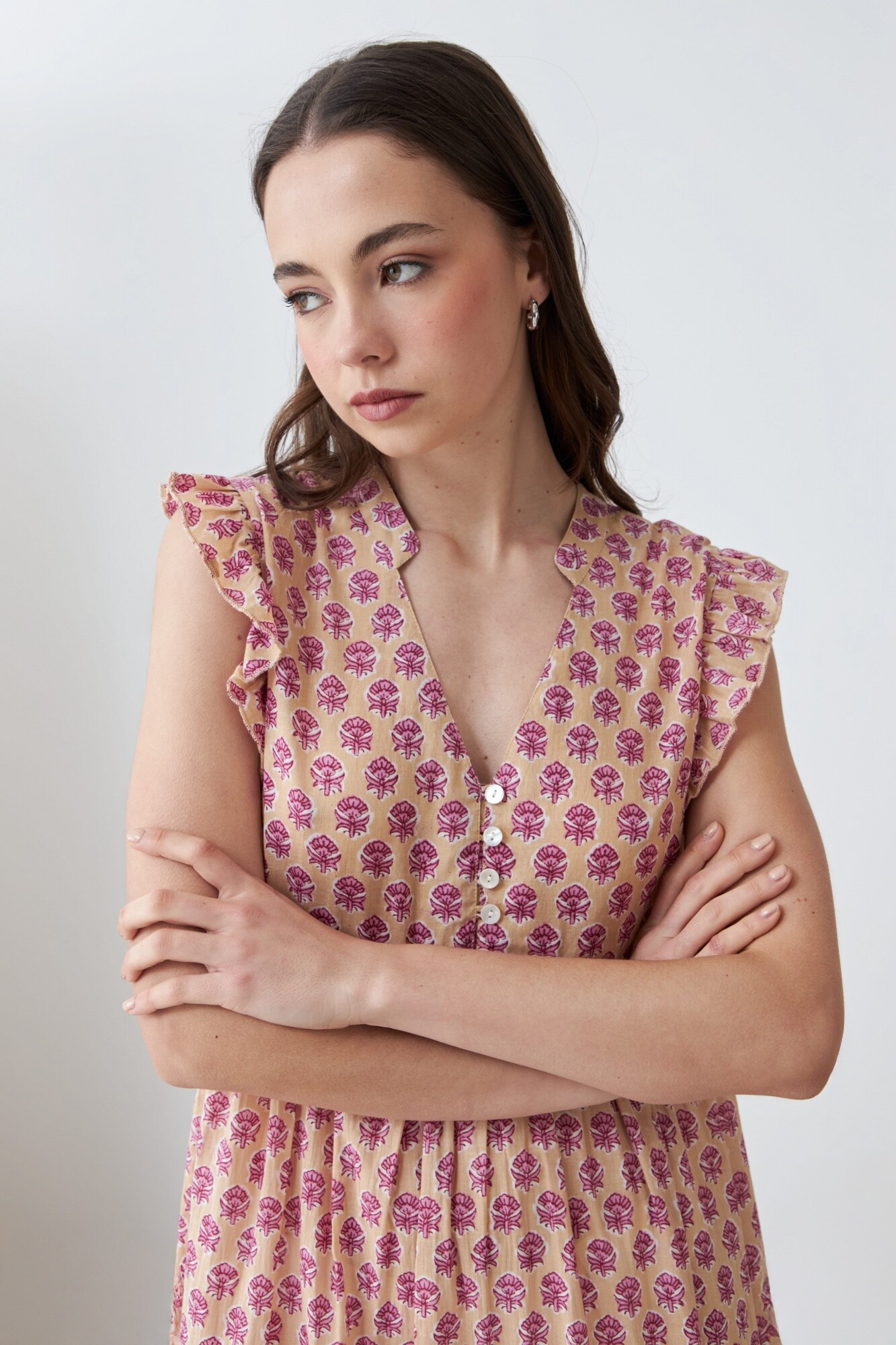 $ 2.117 * el descuento es aplicado sobre el primer precio de la temporada. Vestido de escote en V con volados.