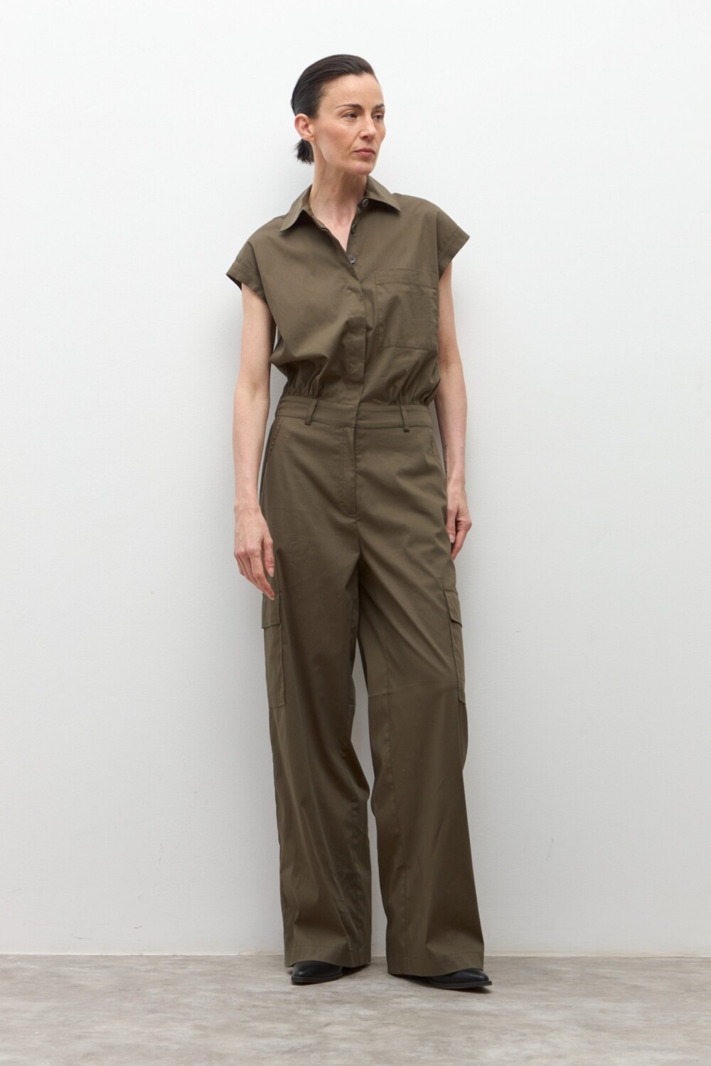 Mono de cuello solapa y manga corta. Bolsillos delanteros. Piernas anchas. Cintura elástica en espalda.