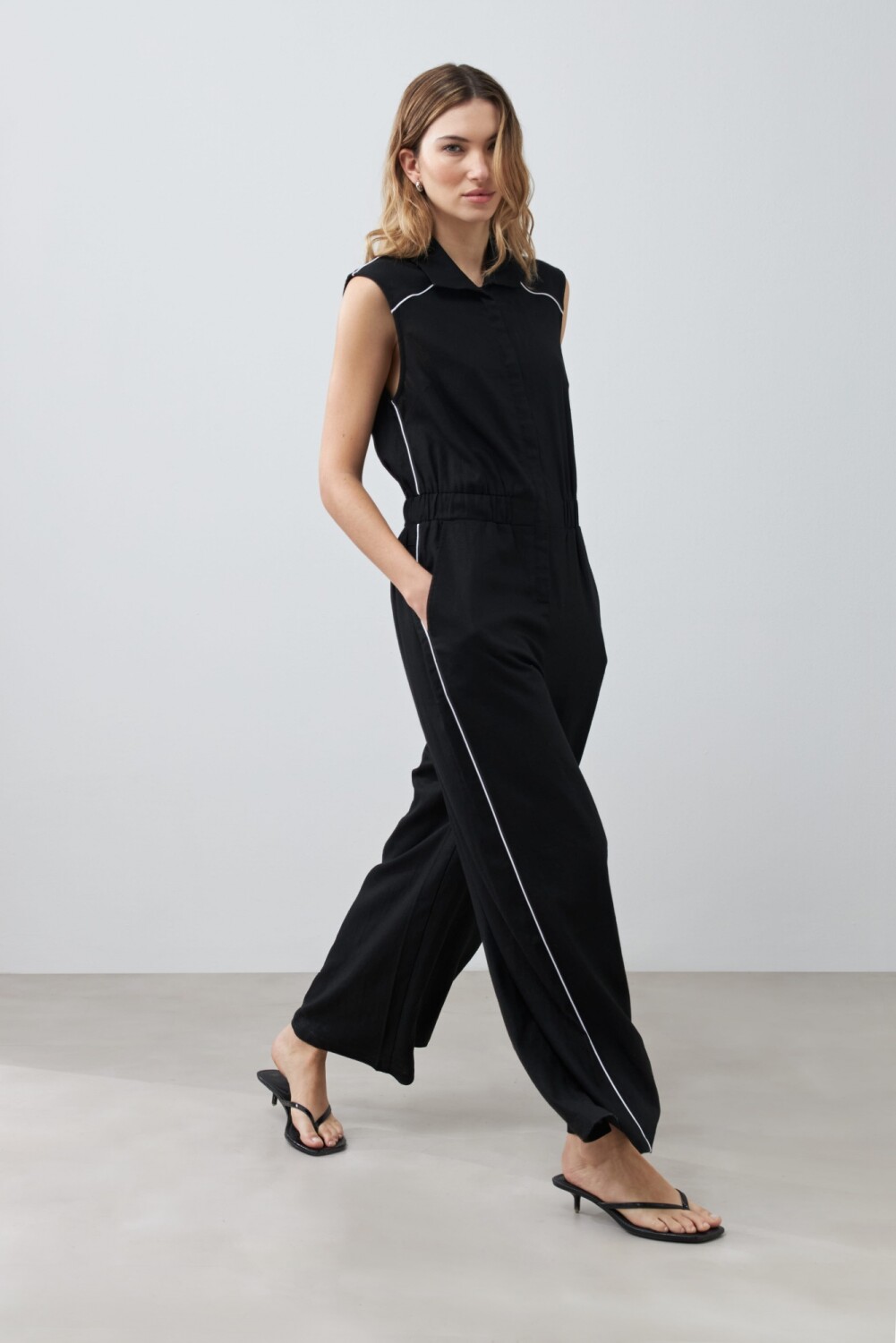 Mono con cuello camisero y vivo en contraste.
