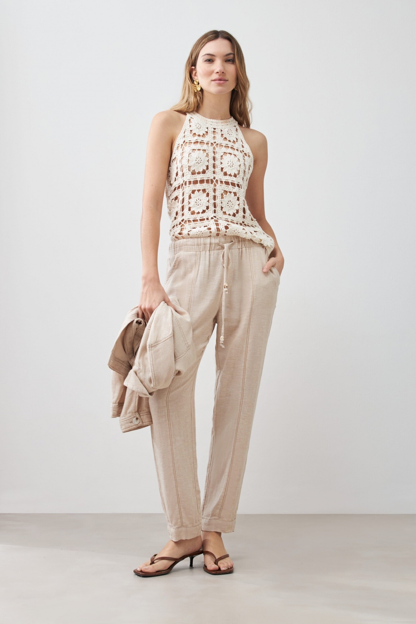 Pantalón pijama de lino con pespuntes en contraste - beige melange