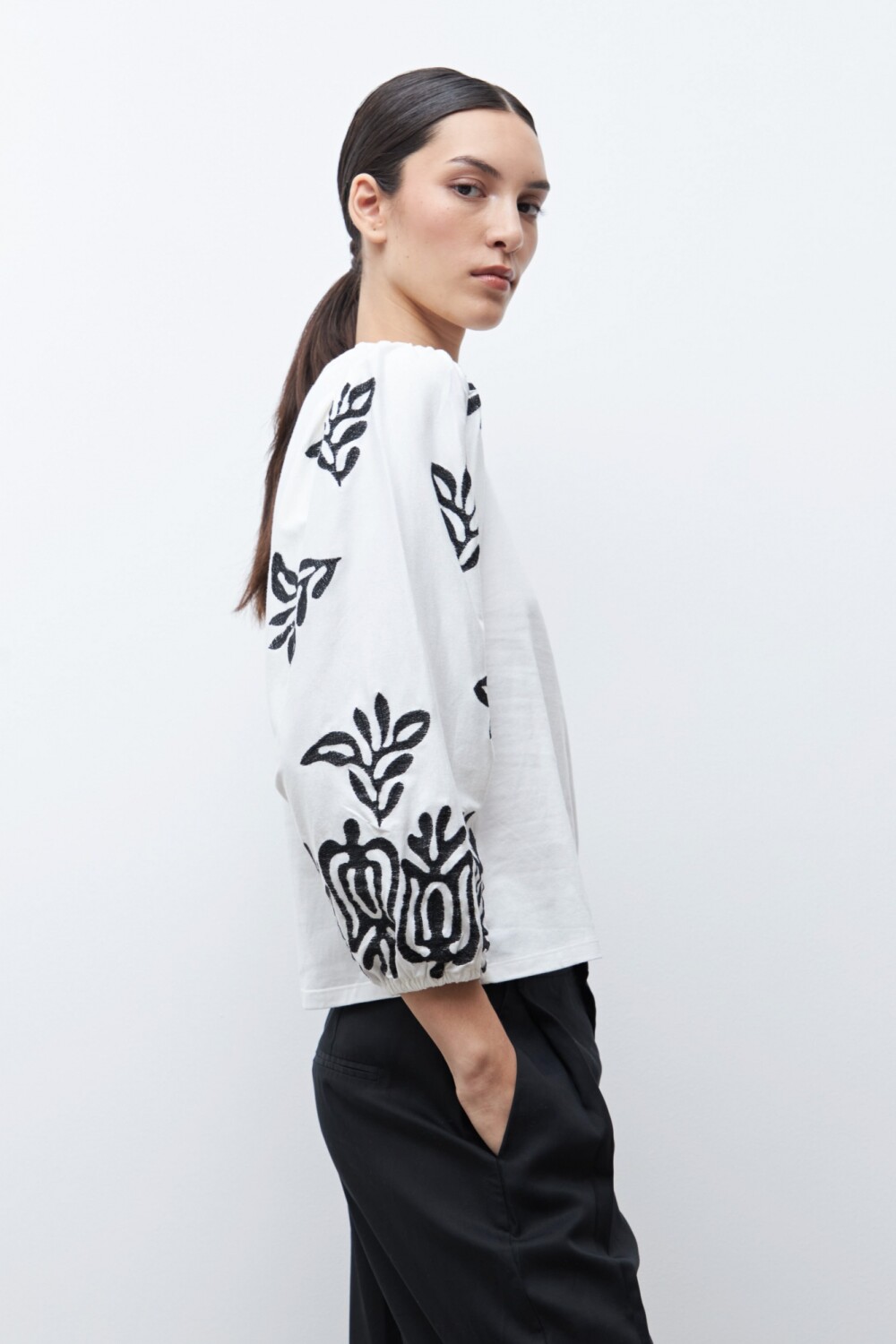 Remera de escote a la base. Manga larga abullonada con bordados en contraste.
