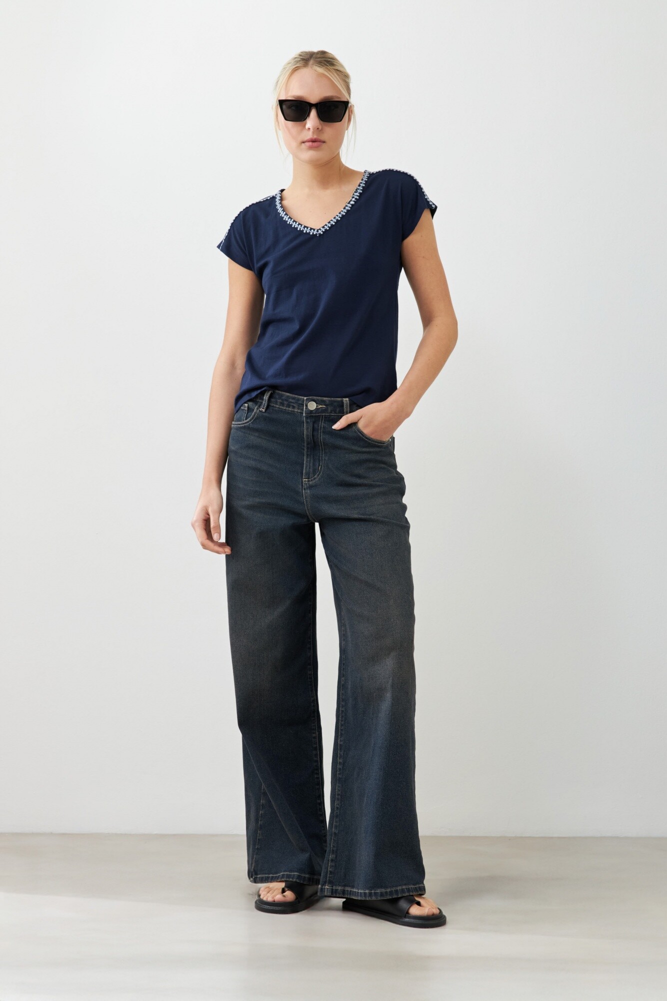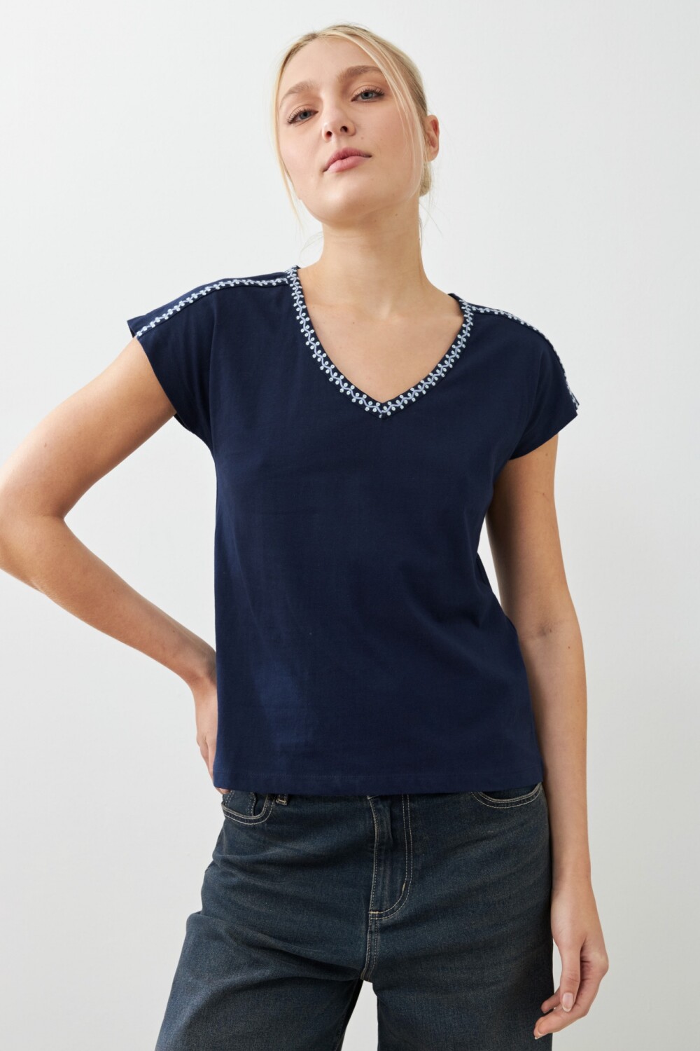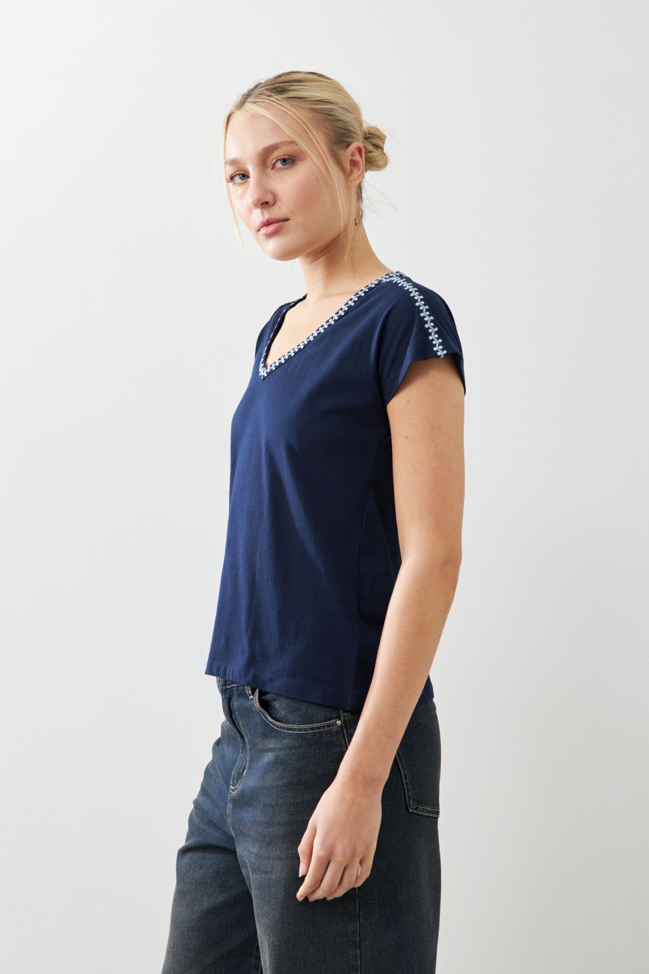 Remera de escote en V y manga corta con detalle de bordado en escote y hombros.