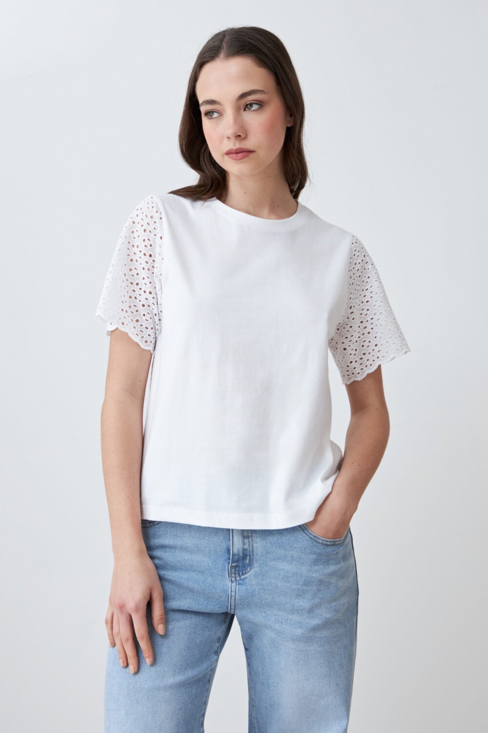 $ 1.182 * el descuento es aplicado sobre el primer precio de la temporada. Remera de escote a la base y manga corta en broderie.