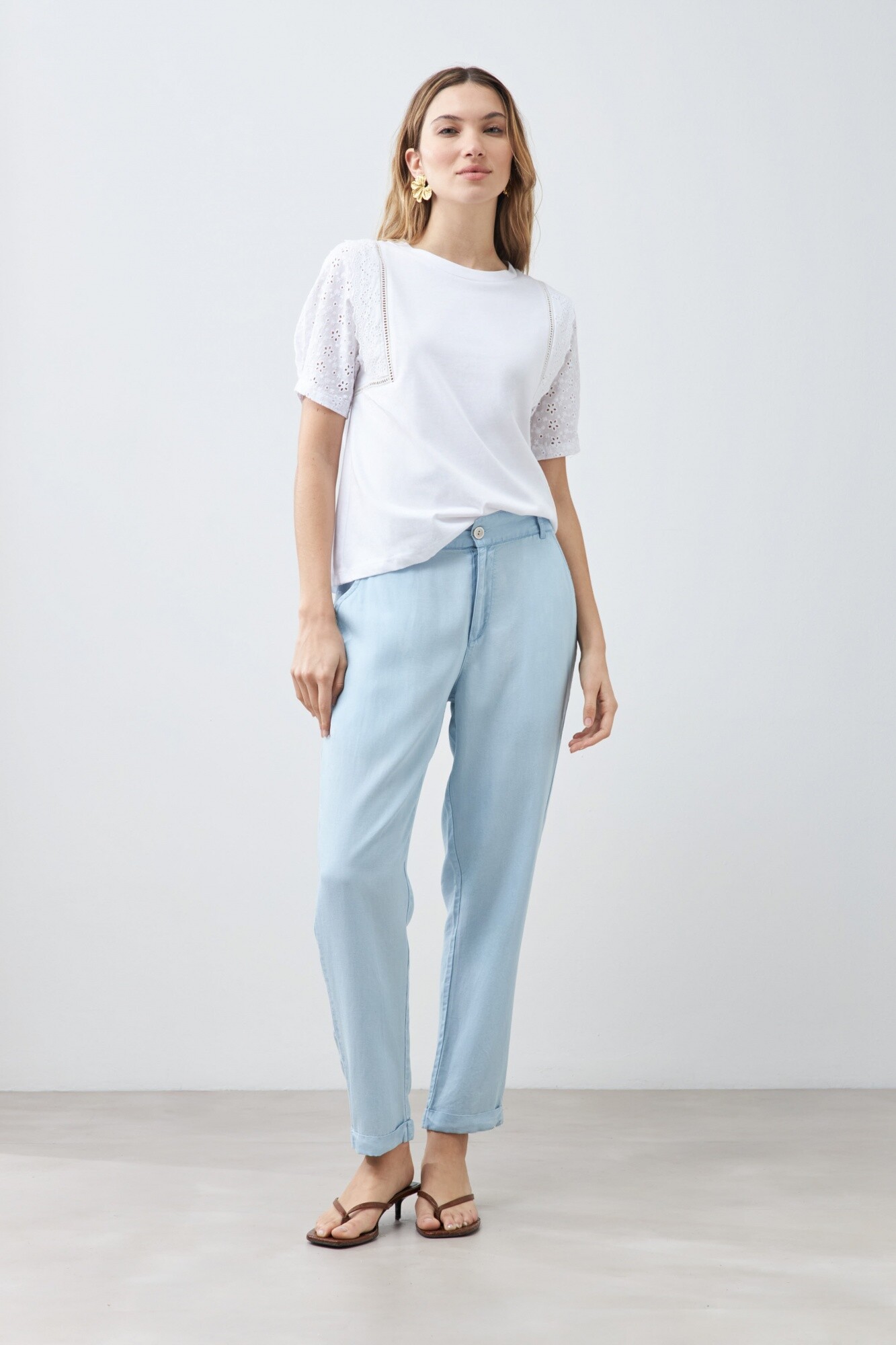 Remera de escote a la base y manga corta en broderie.