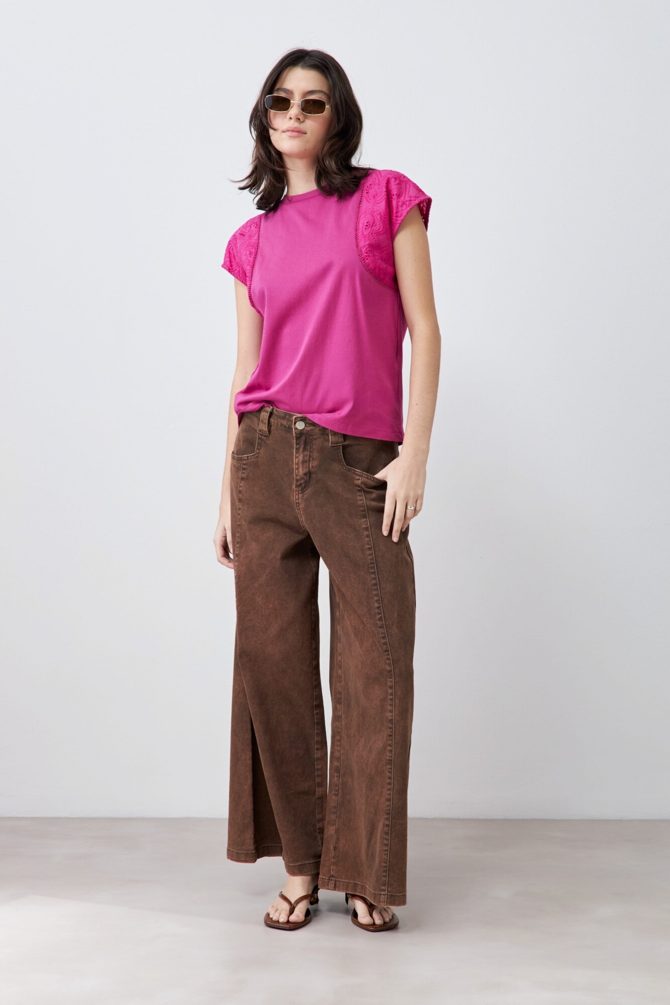 Remera de escote a la base y manga corta con detalle de vainillas y broderie.