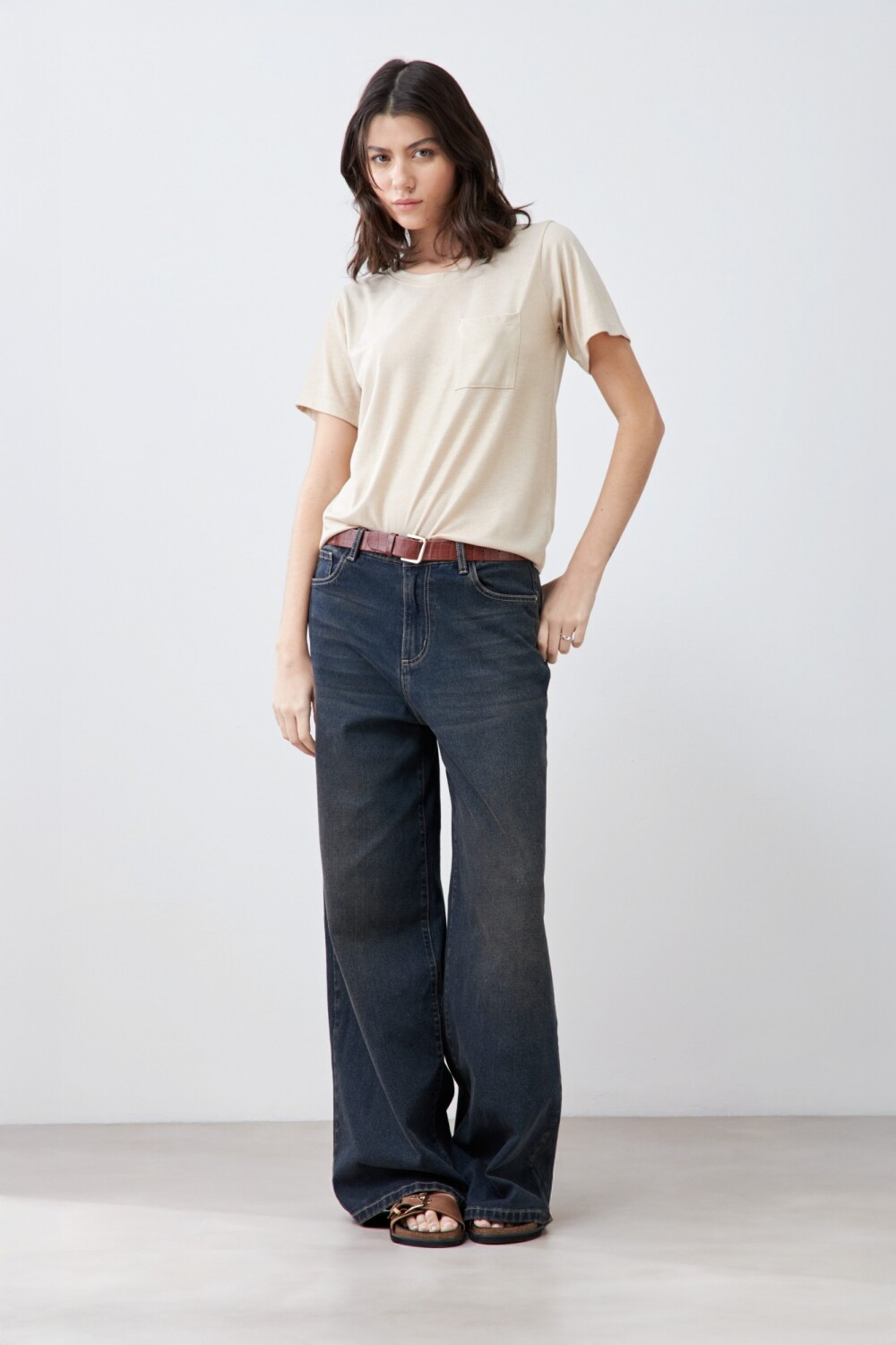 Remera confeccionada en lurex de manga corta. Bolsillo de delantera.