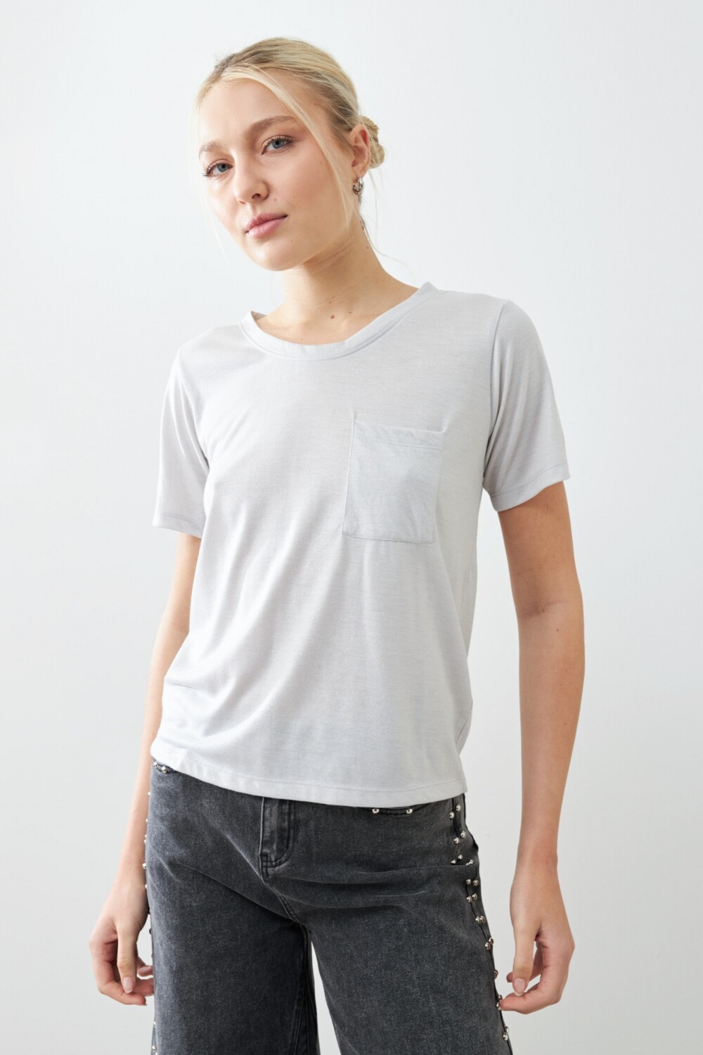 Remera confeccionada en lurex de manga corta. Bolsillo de delantera.