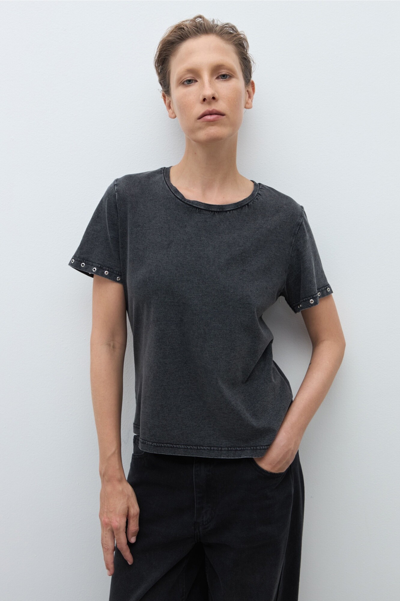 Remera de escote a la base y manga corta. Detalle de ojalillos metálicos en puño.