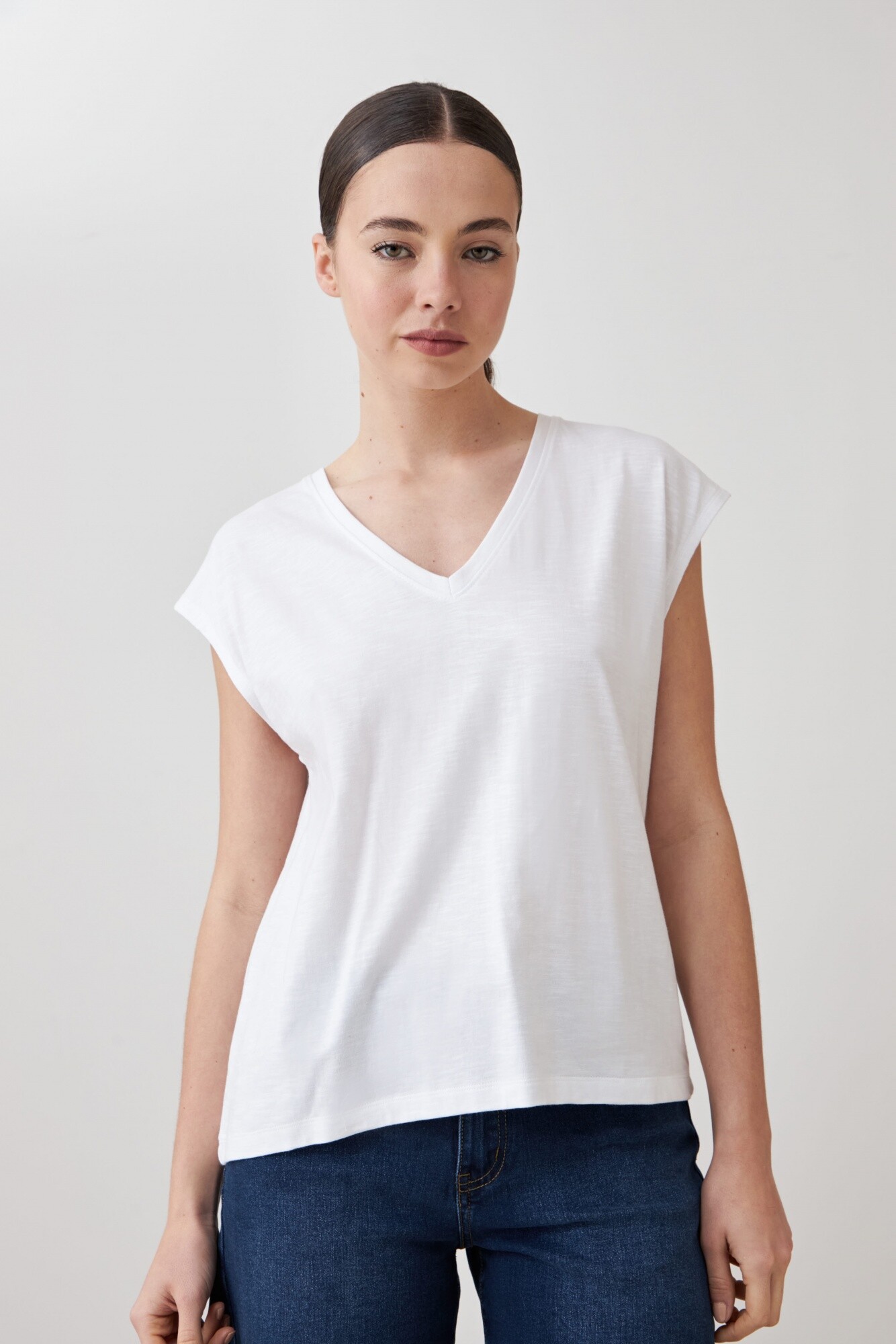 $ 842 * el descuento es aplicado sobre el primer precio de la temporada. Remera de escote en V y manga corta.