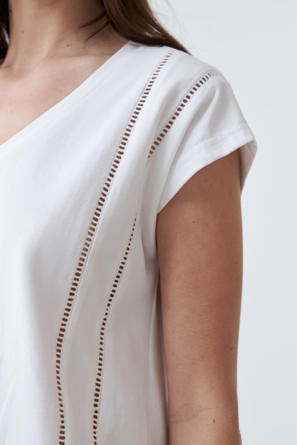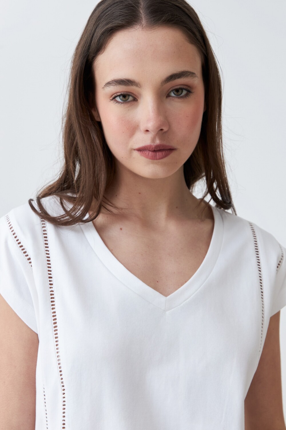 $ 842     Remera de escote en V y manga corta con detalle de vainillas en laterales.