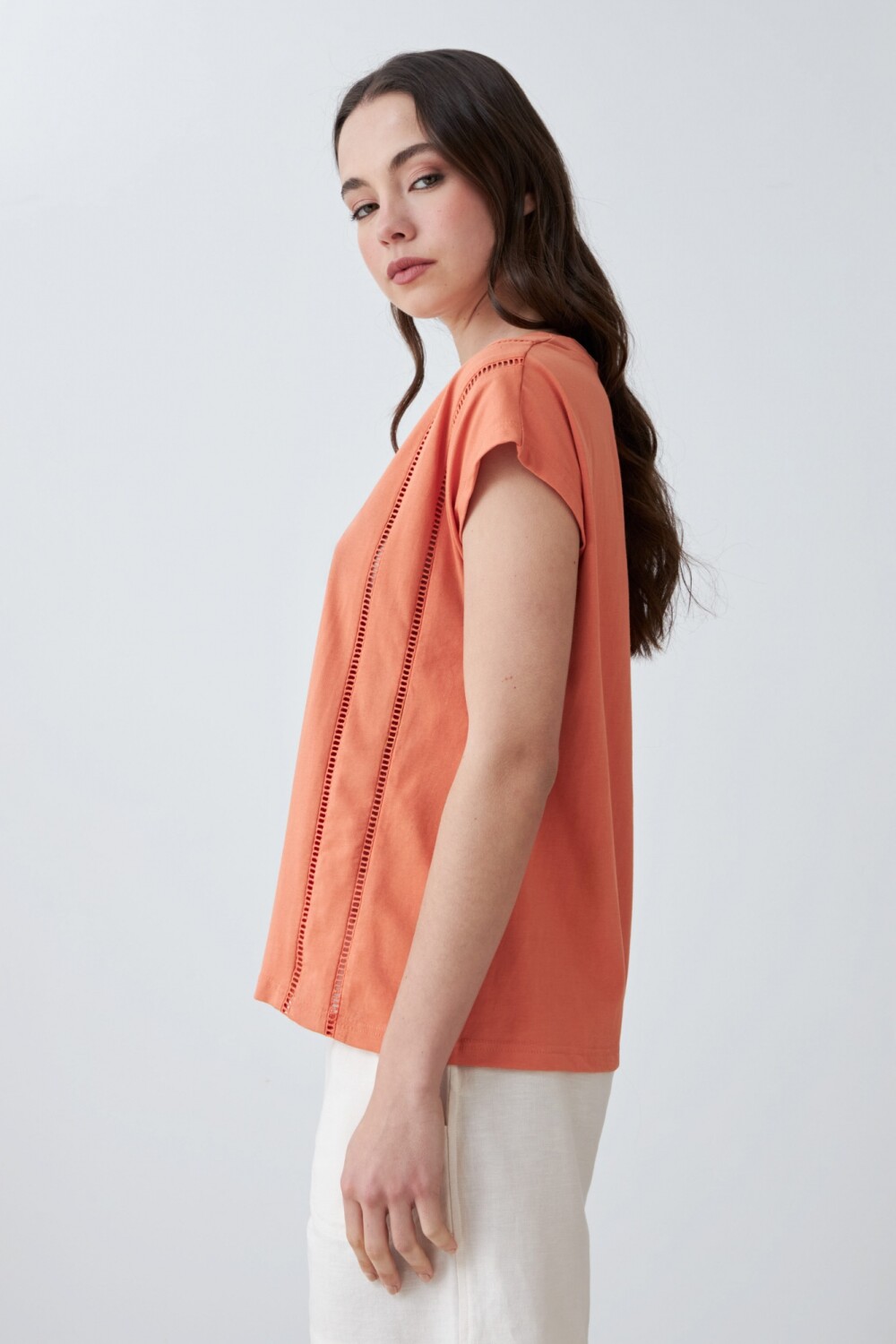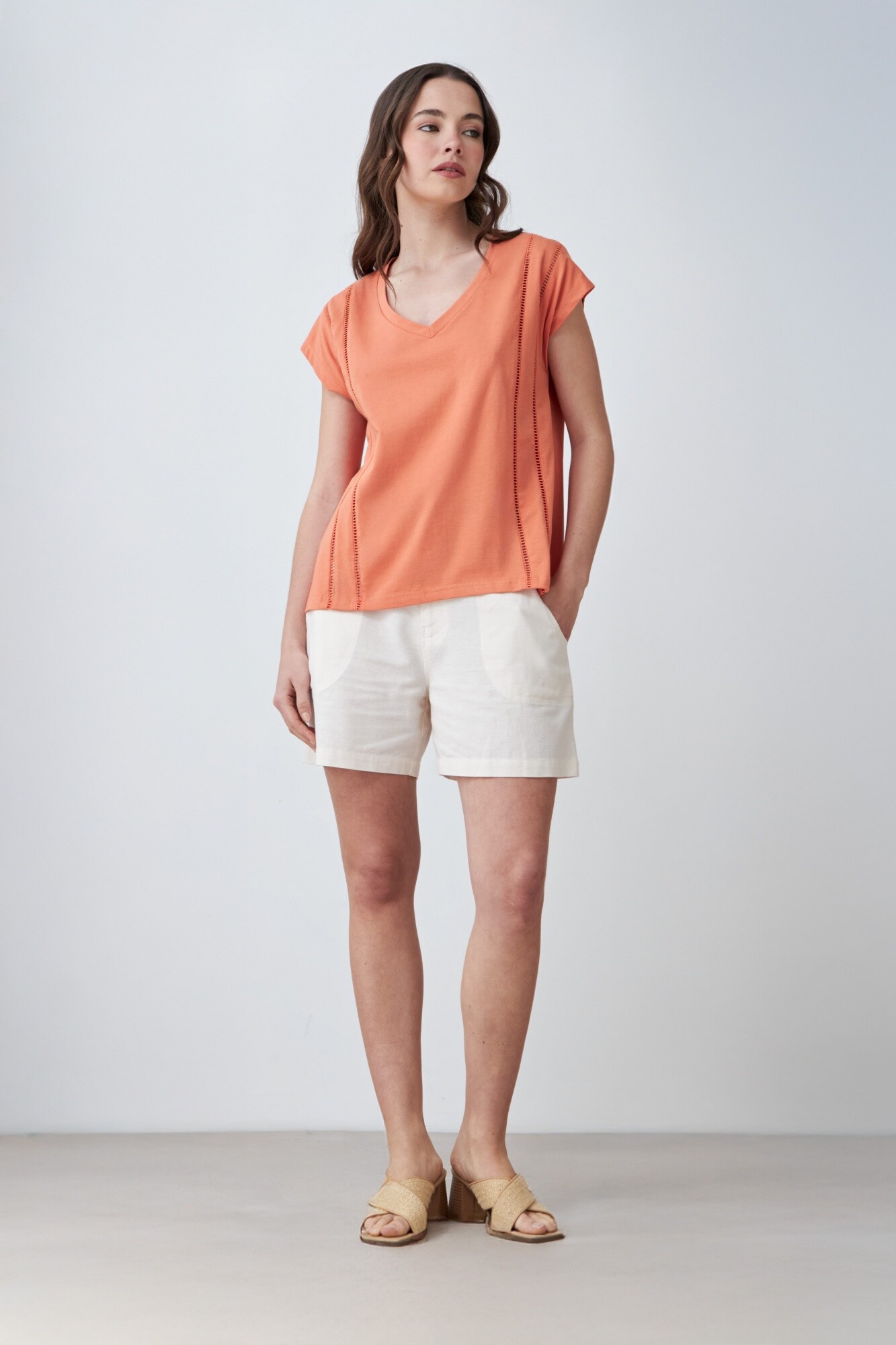 $ 842     Remera de escote en V y manga corta con detalle de vainillas en laterales.