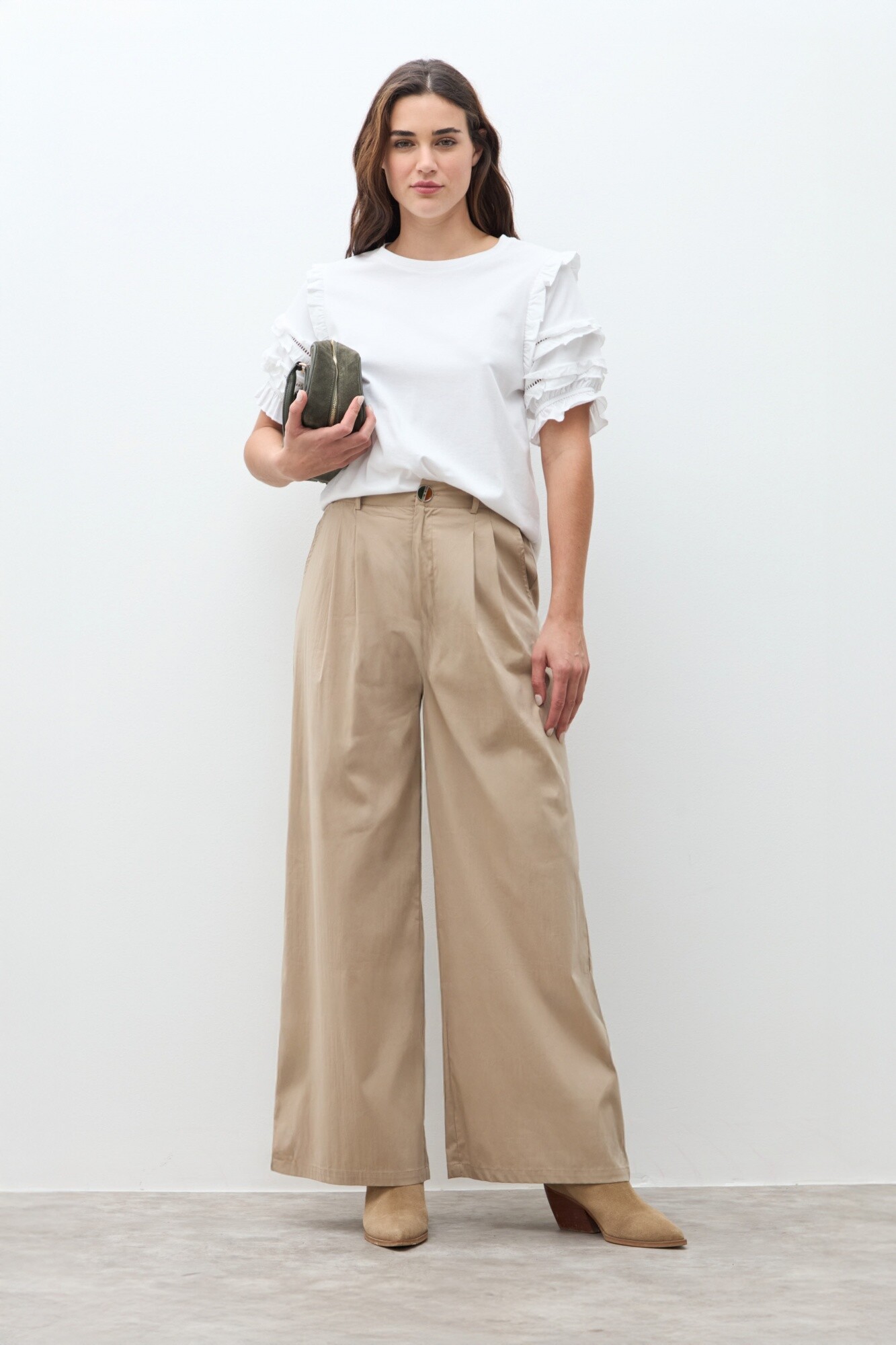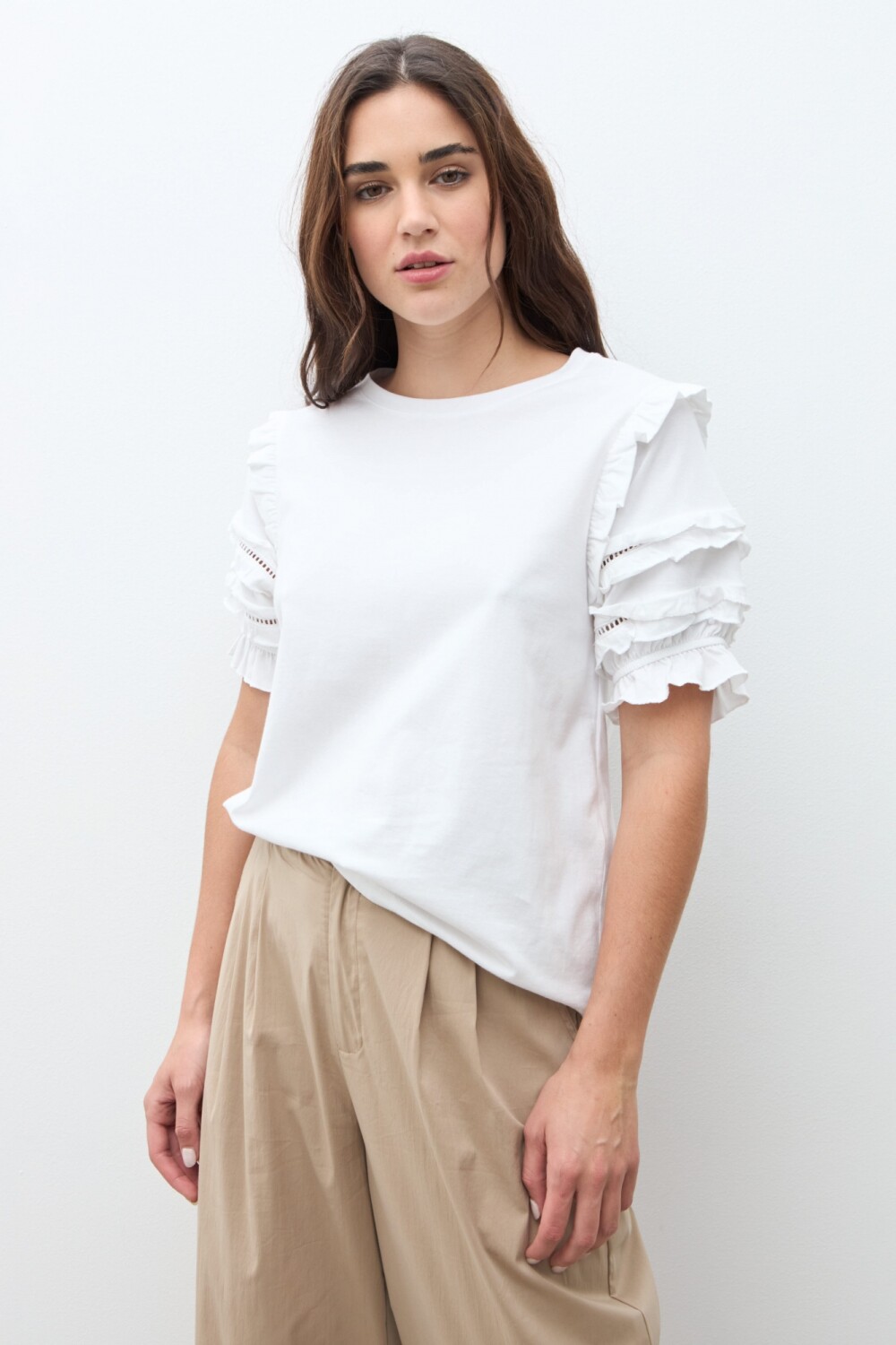 Remera de escote a la base. Manga corta con volados.