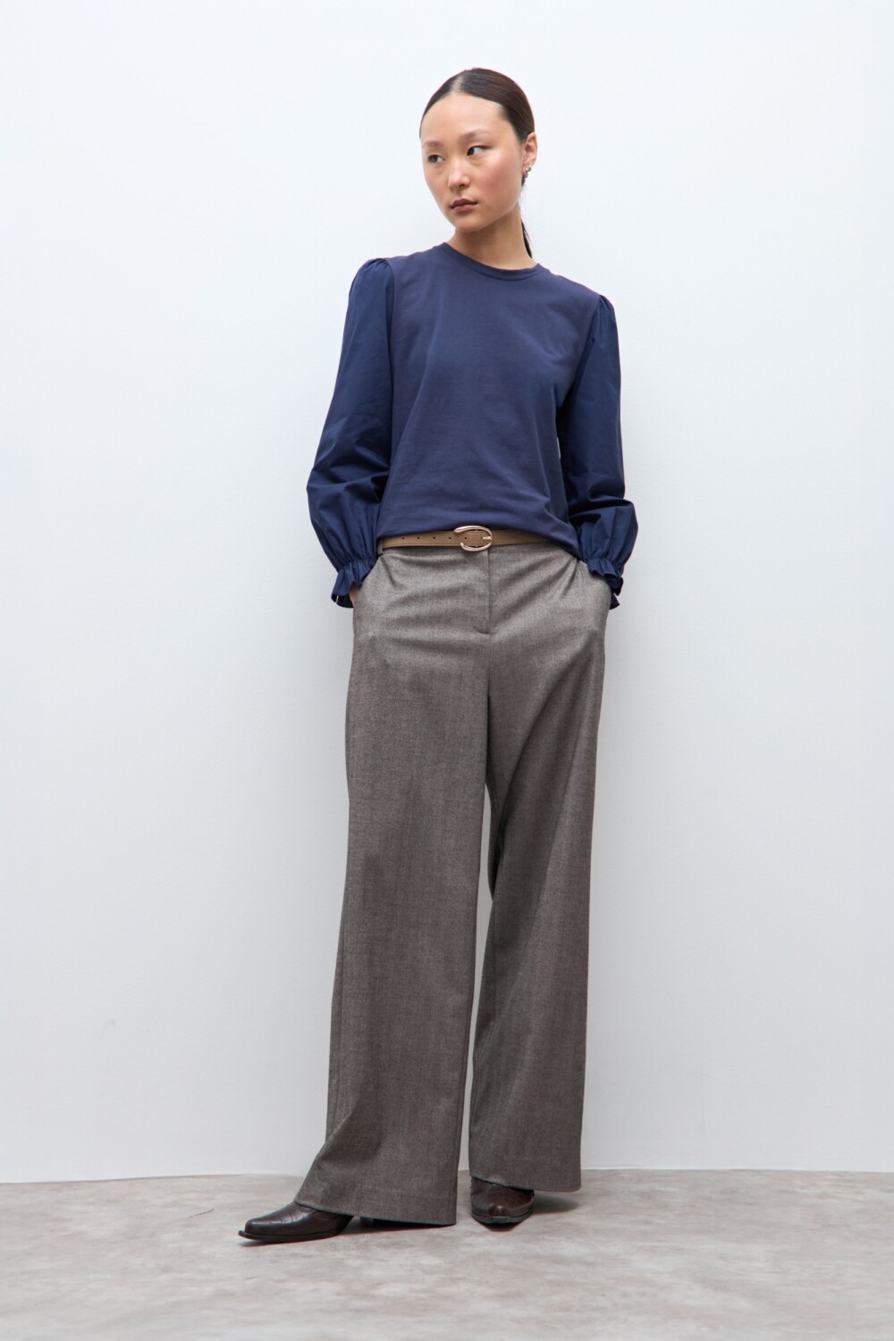 Remera de escote a la base. Manga larga confeccionada en poplin. Elástico en puños.