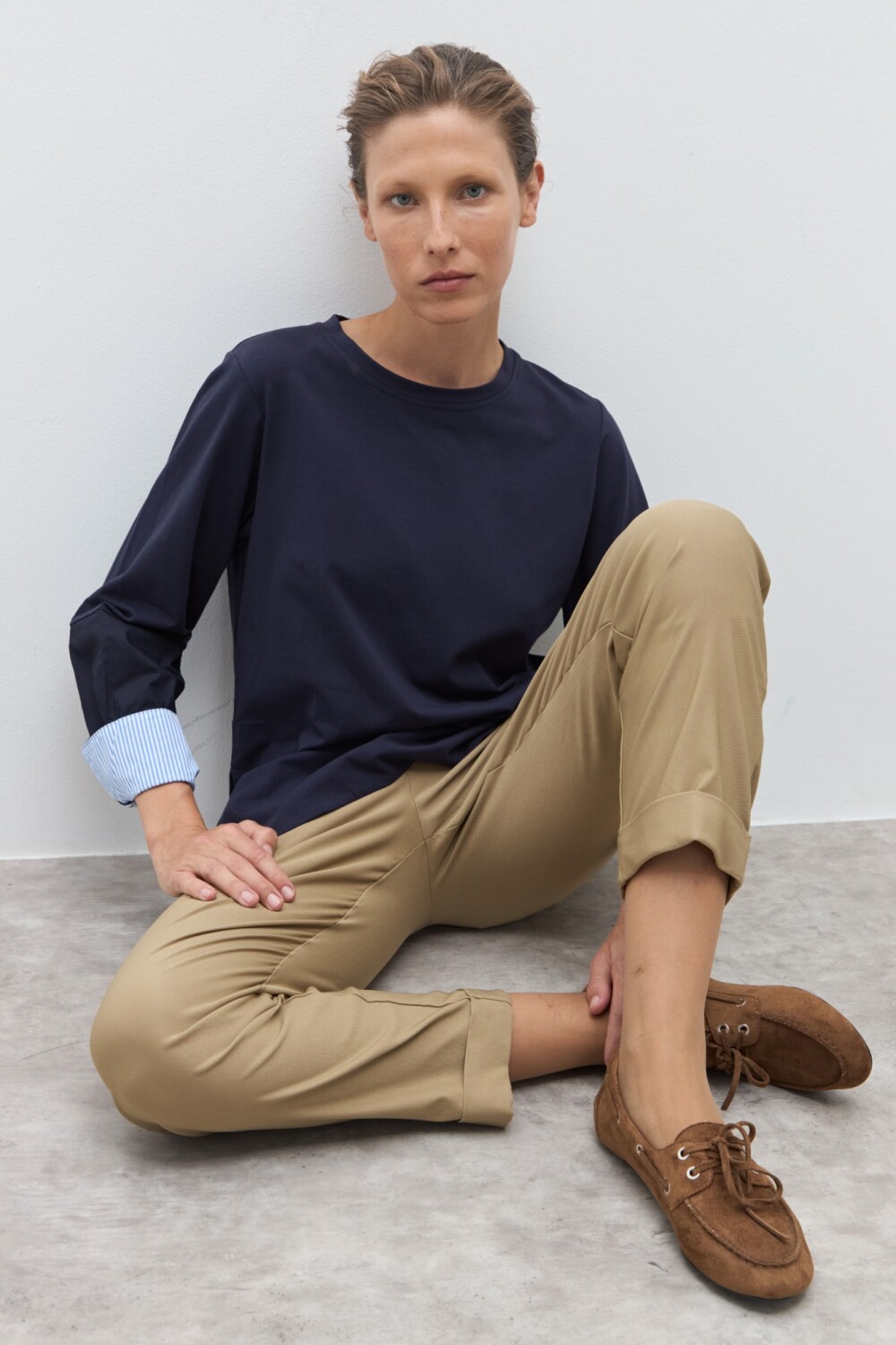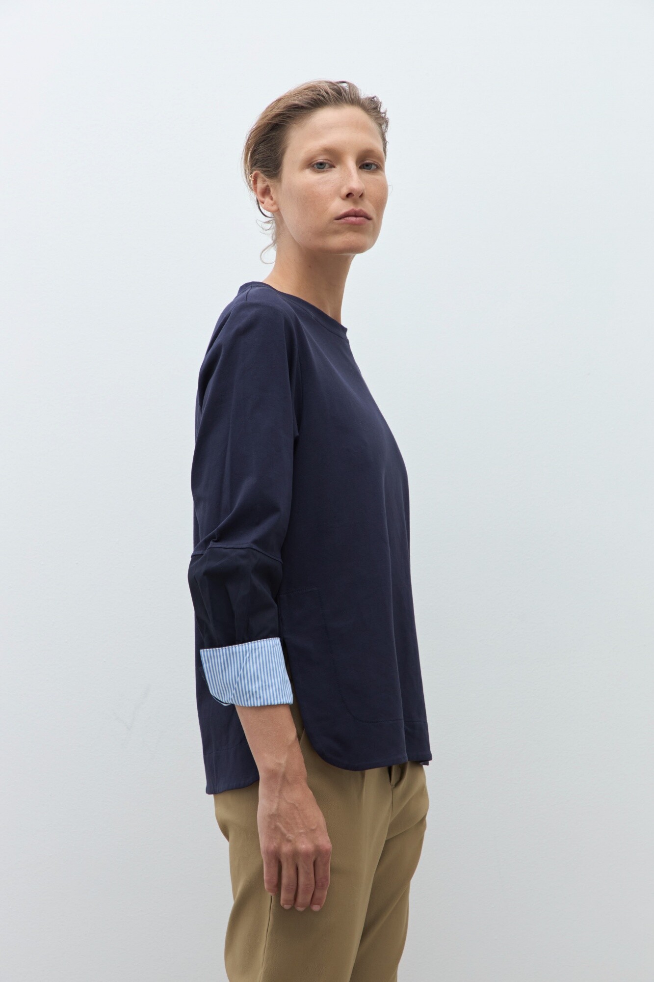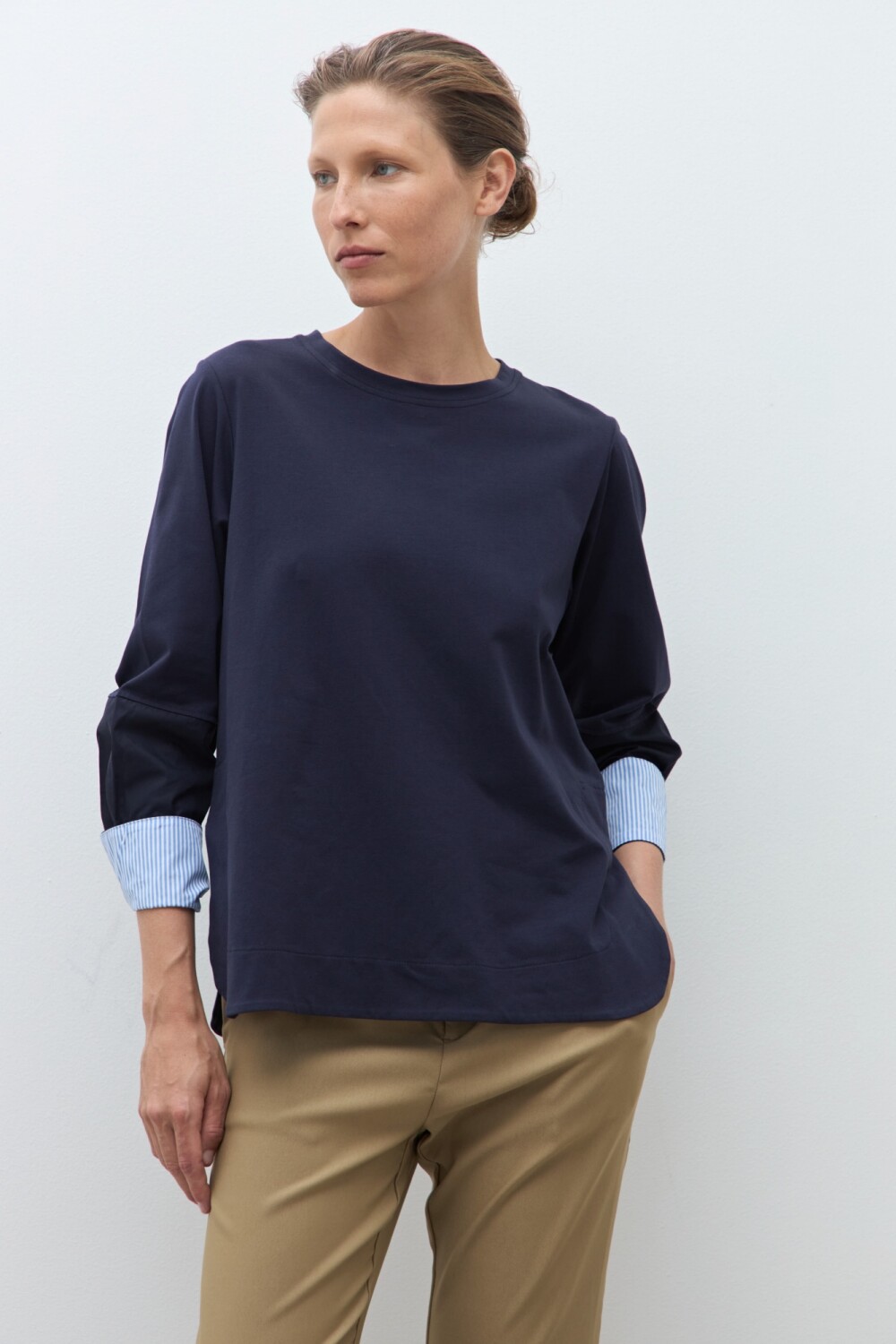 Remera de escote a la base. Manga larga acabada en puño a rayas.