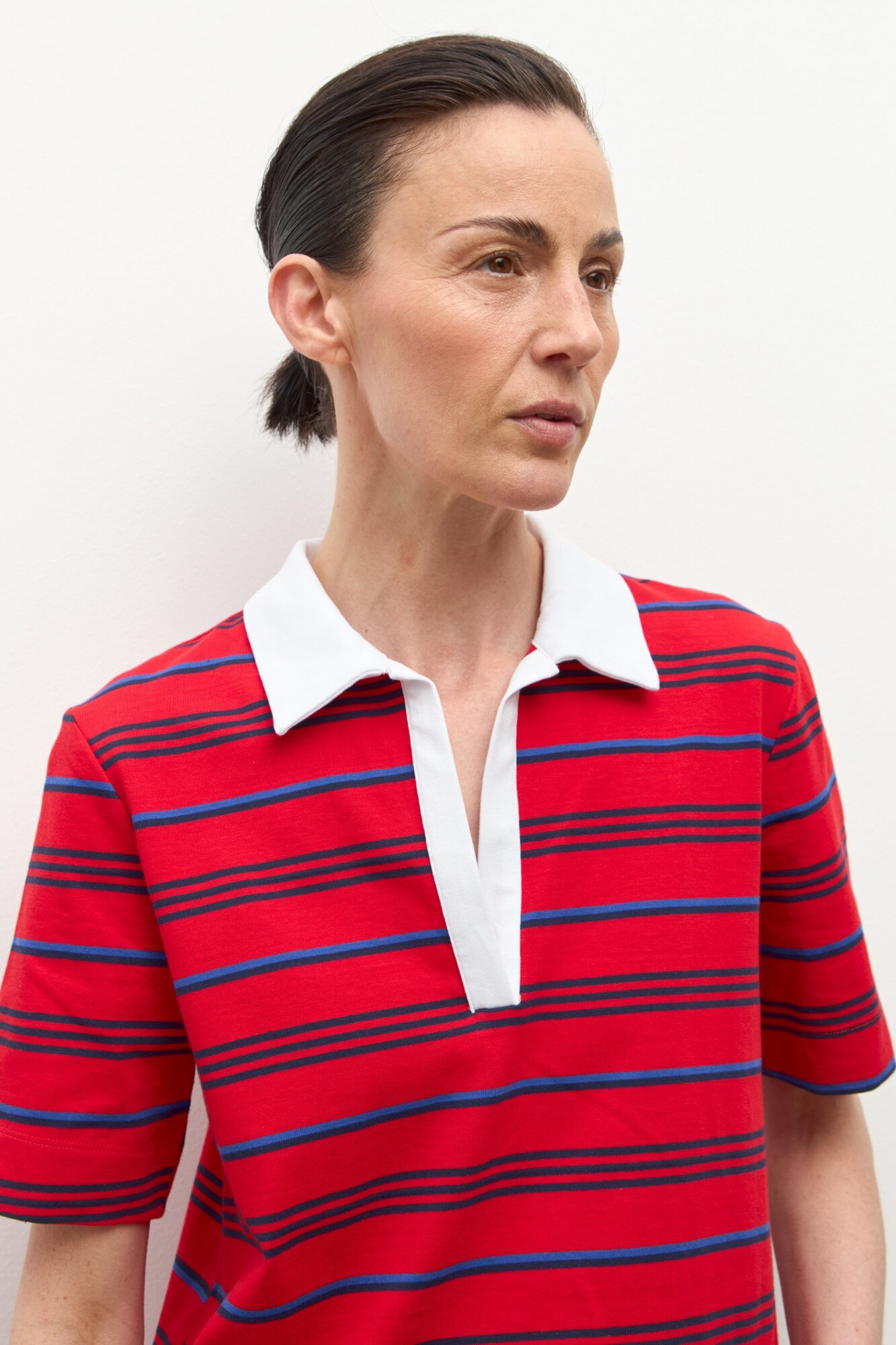 Remera con cuello polo y escote en V. Manga tres cuartos.