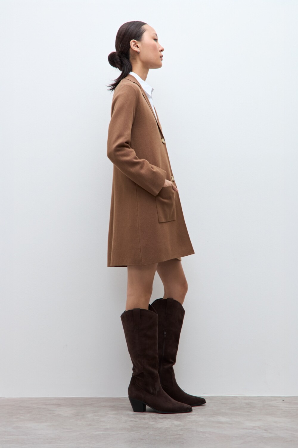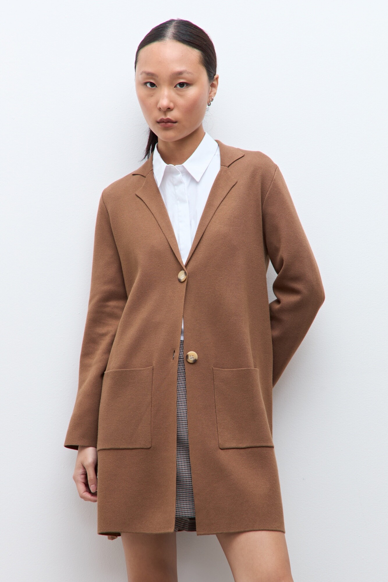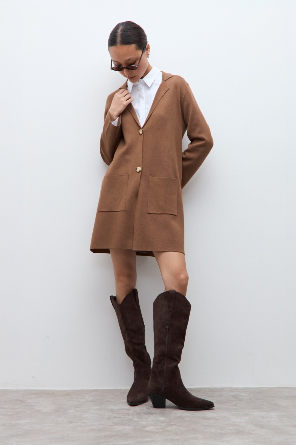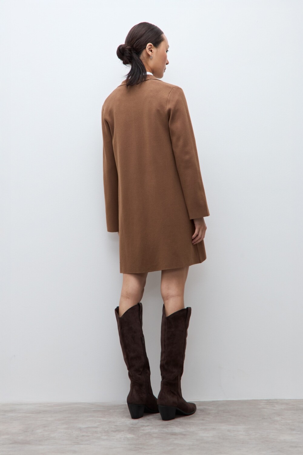 $ 2.797 * el descuento es aplicado sobre el primer precio de la temporada. Sacón tejido de escote en V. Manga larga.