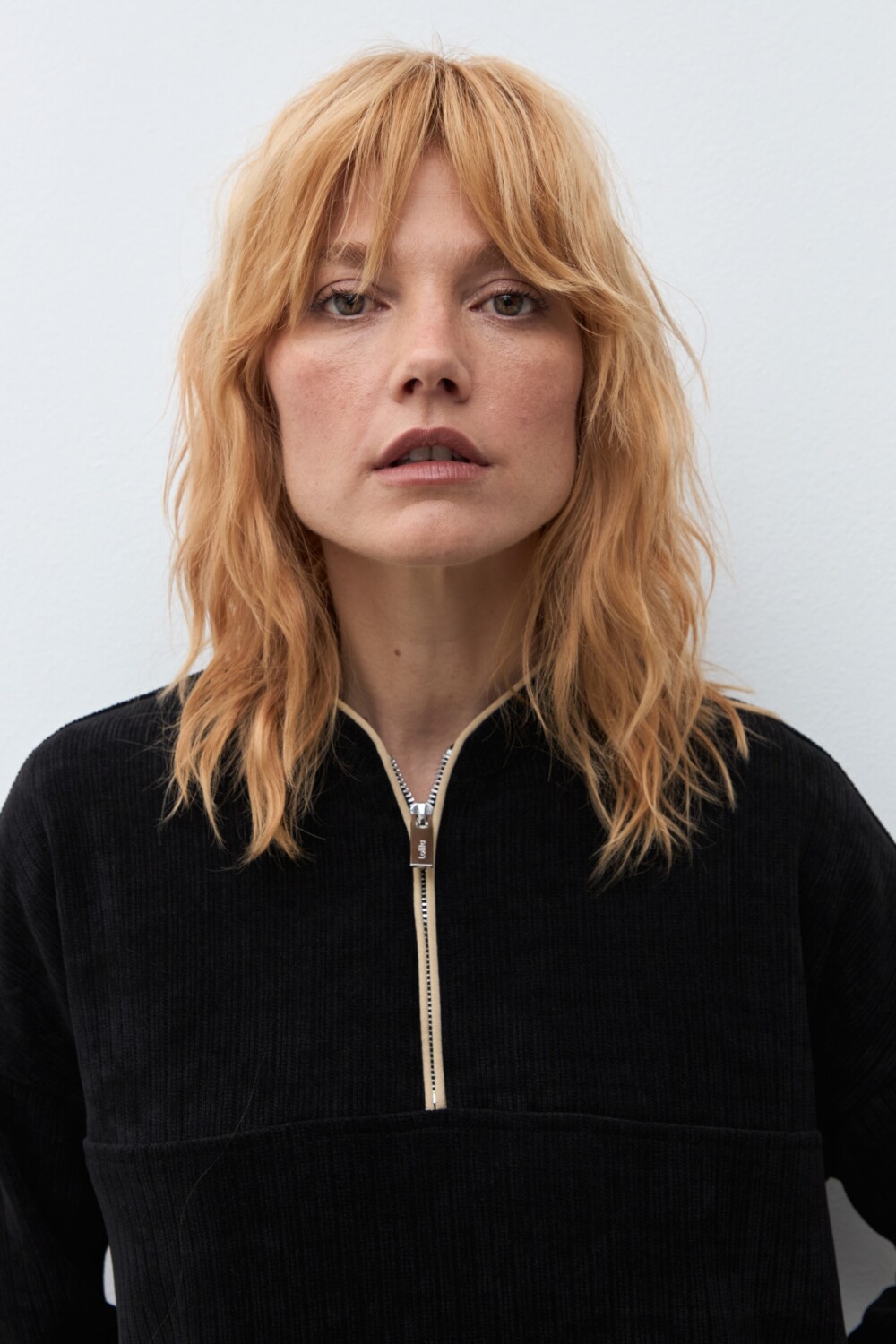 $ 1.947 * el descuento es aplicado sobre el primer precio de la temporada. Sweater acanalado. Cuello alto con cierre. Manga larga.