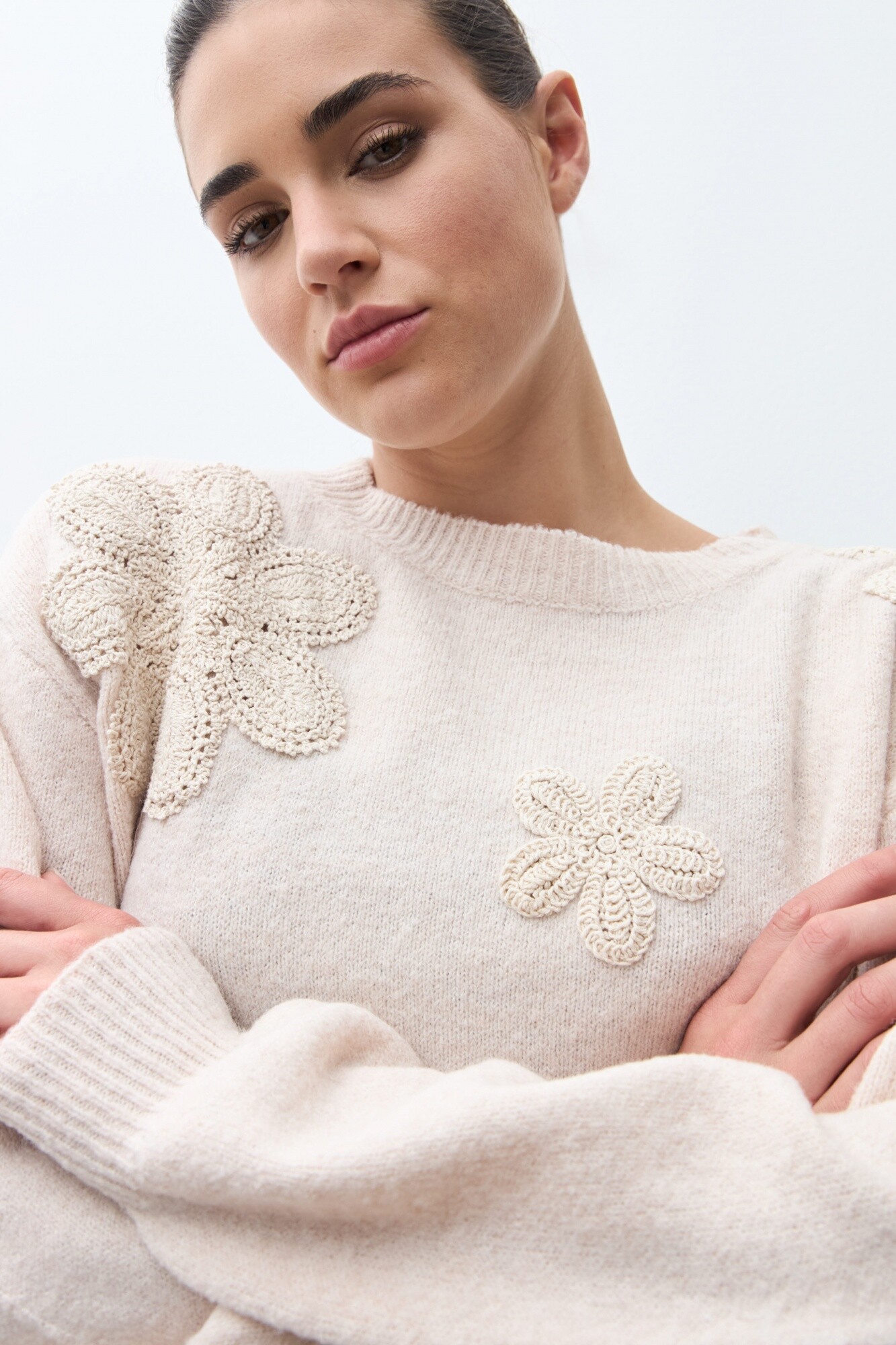 Sweater de escote a la base. Manga larga. Apliques florales a tono.