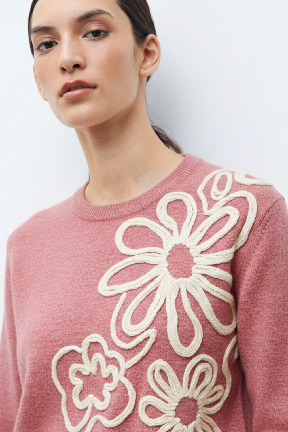 Sweater de escote a la base. Manga corta. Bordado a contratono en delantera.