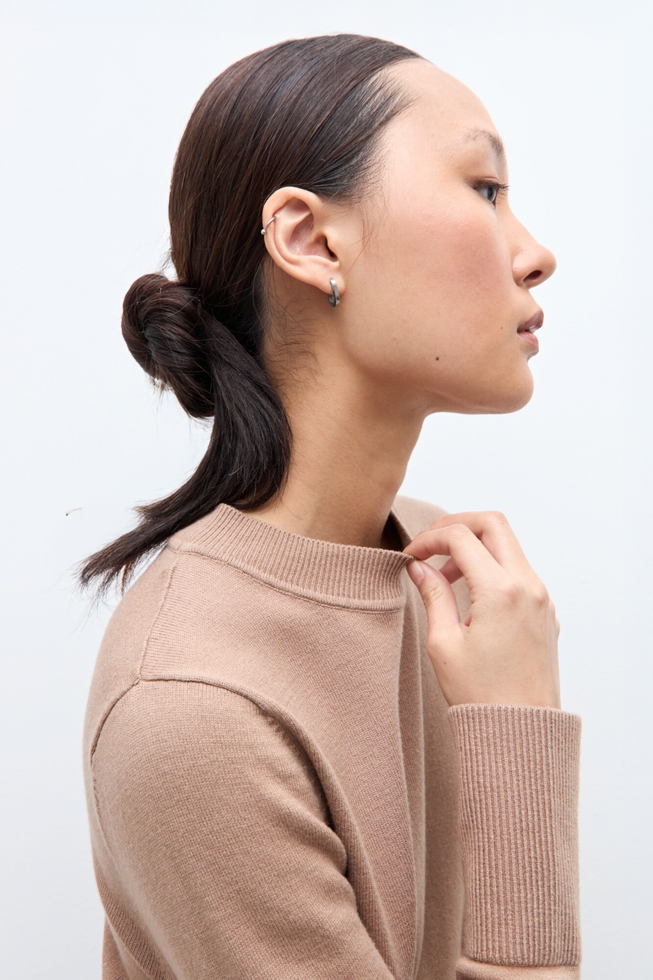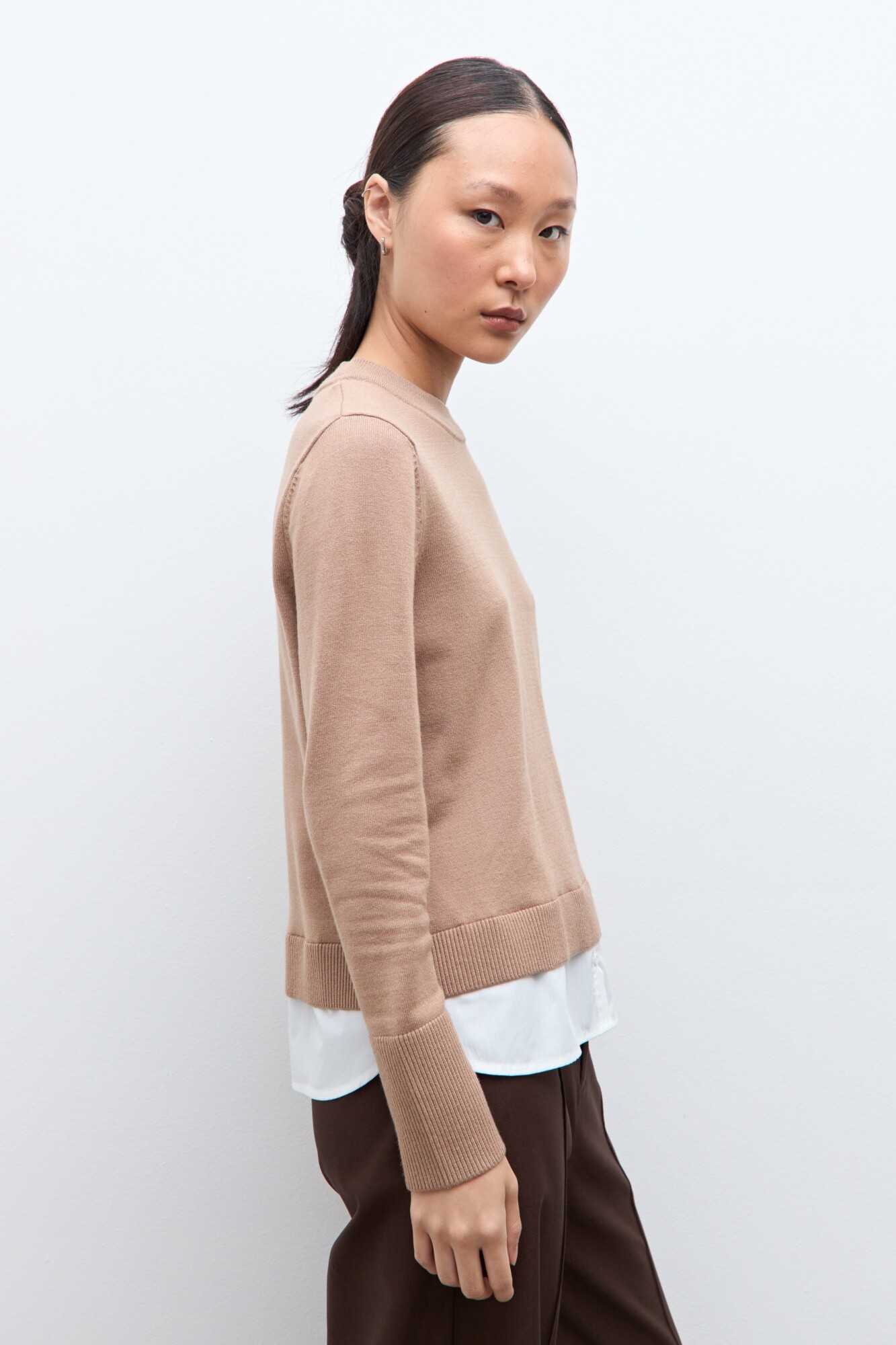 Sweater de escote a la base. Combinado con camisa en bajo. Manga larga.