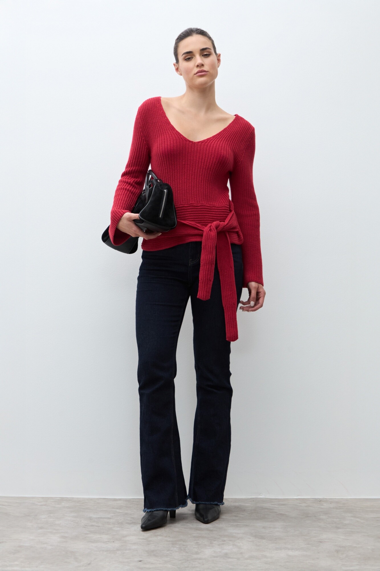 $ 1.947 * el descuento es aplicado sobre el primer precio de la temporada. Sweater de escote en V. Manga larga. Lazo de ajuste en cintura.