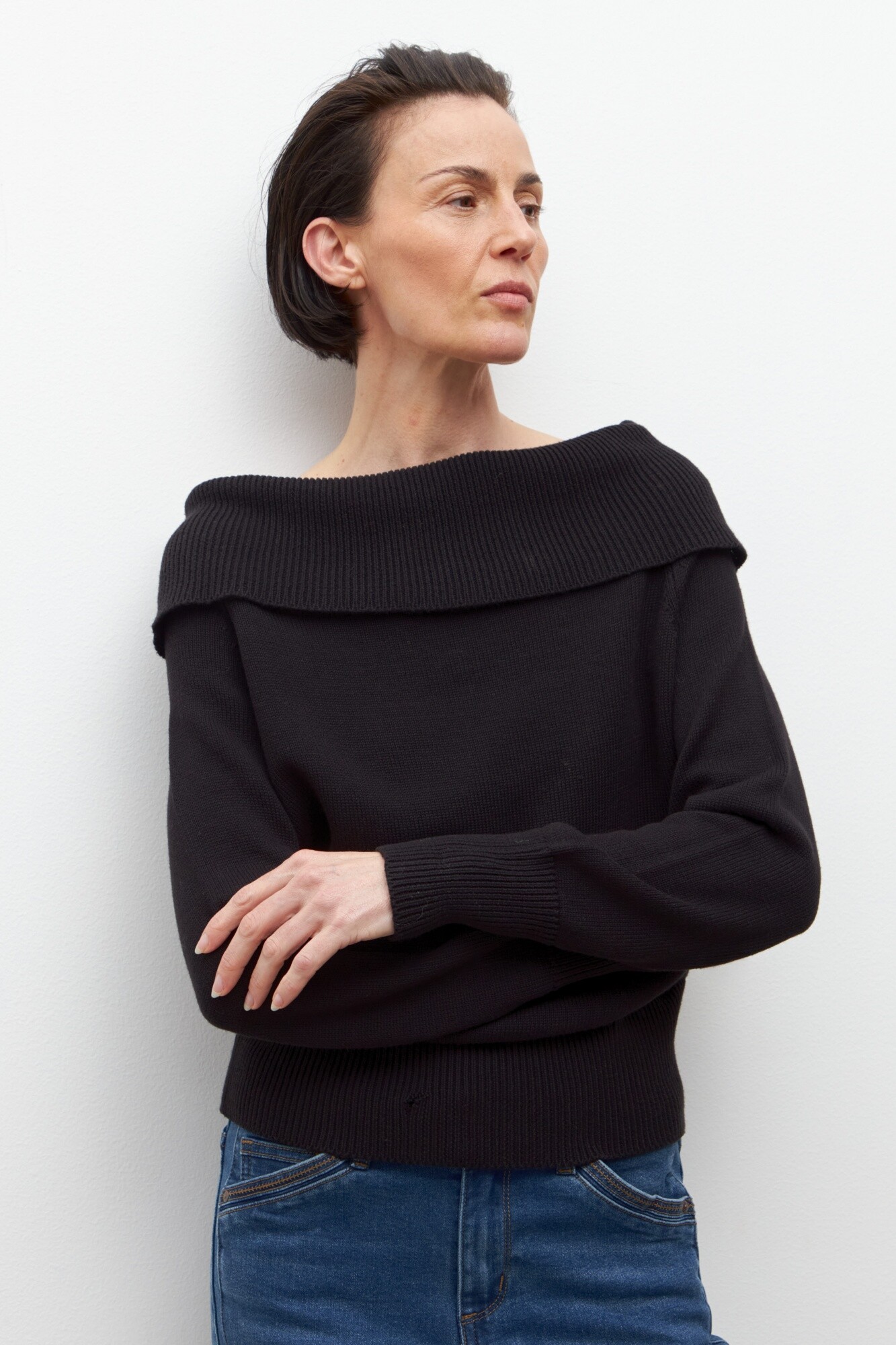 Sweater de escote recto y hombros descubiertos. Manga larga acabada en puño.
