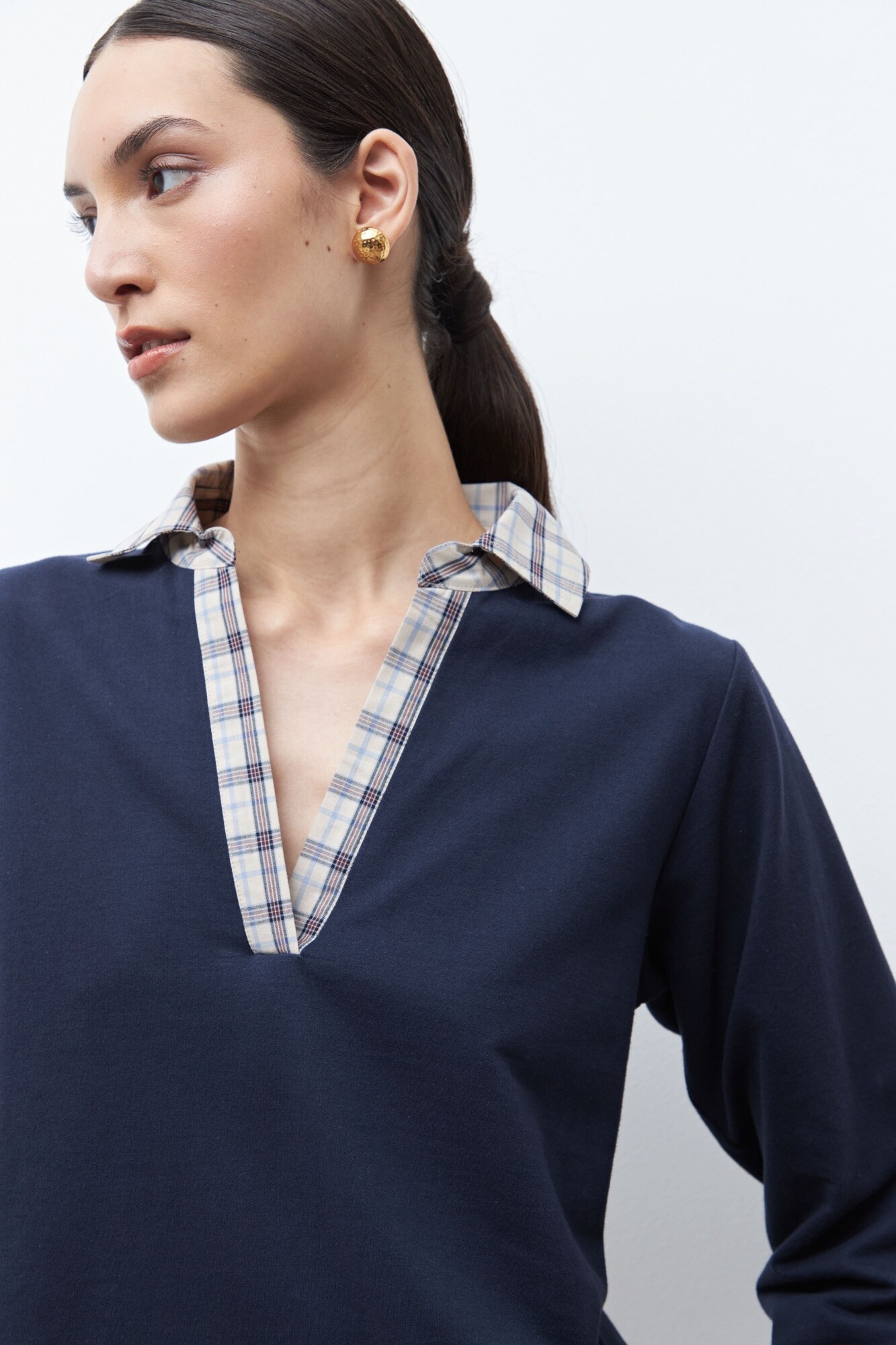 Sudadera combinada con camisa. Cuello polo. Escote en V.